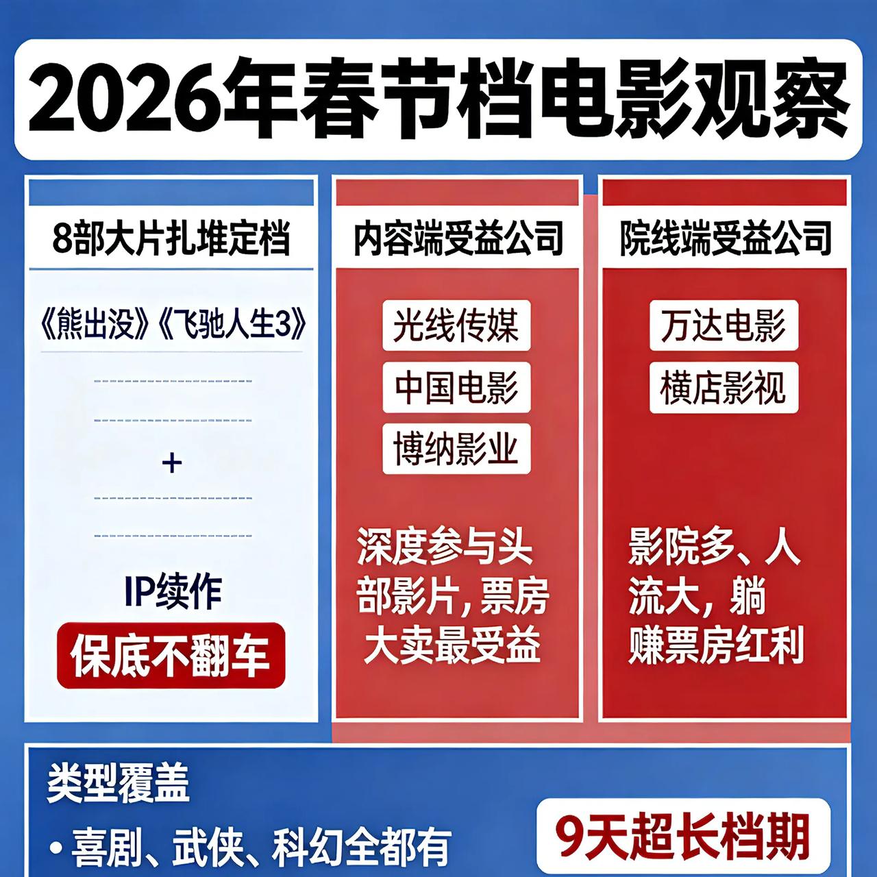 8部大片定档春节档!这些公司直接受益 今年春节档太卷了,8部电影扎堆,9天超长档期,票房稳了! ① 内容端:光线传媒、中国电影、博纳影业深度参与头部影片,票房大卖最受益 ② 院线端:万达电影、横店影视影院多、人流大,躺赚票房红利 ③ 稳赚款:《熊出没》《飞驰人生3》这类IP续作,保底不翻车 今年喜剧、武侠、科幻全都有,院线与影视板块迎来利好。 你最想看哪一部?评论区聊聊~ 春节档电影 影视板块 2026春节档影视 飞驰人生 熊出没 请说出一部电影,证明你不再年轻