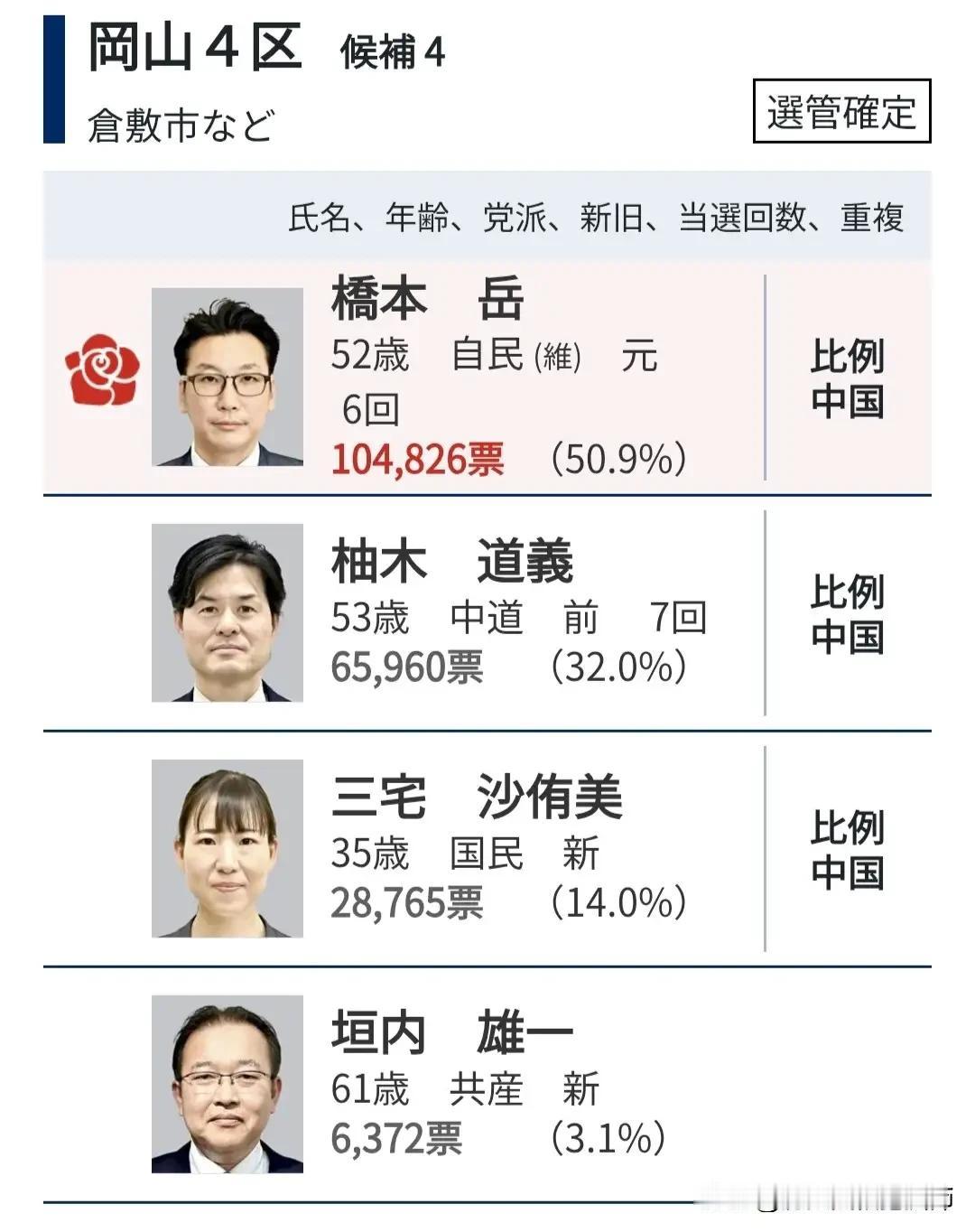 桥本龙太郎的儿子桥本岳重新当选为众议院议员!在上次众议院选举中落选的桥本龙太郎的儿子桥本岳,这次重新当选为众议院议员! 桥本岳,1974年2月出生,众议院议员,隶属于自由民主党。他的父亲是曾任日本首相的桥本龙太郎。妻子自见英子,现任自民党参议院议员,自见英子的父亲是前国民新党党首、桥本内阁邮政大臣自见庄三郎!