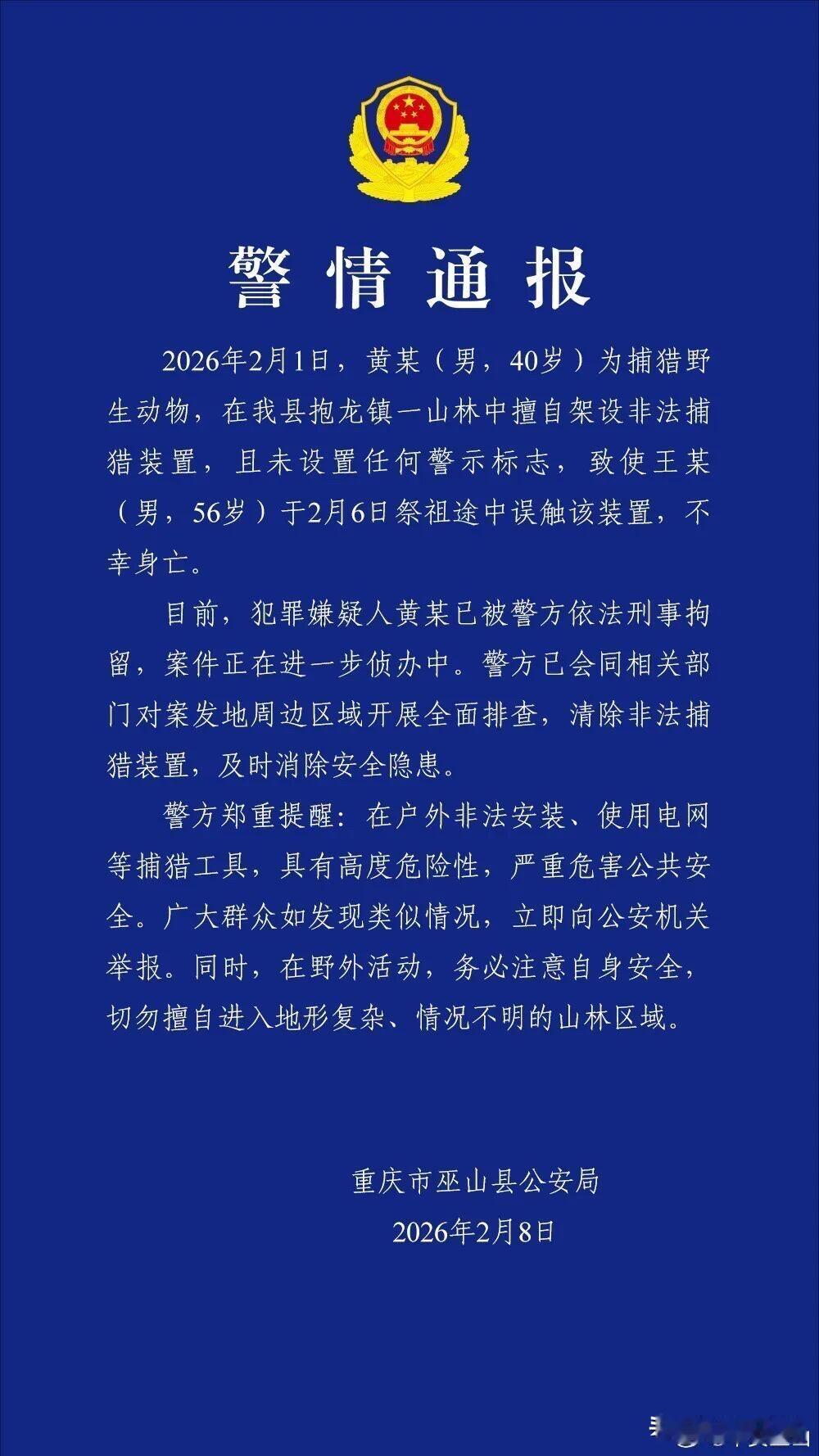 看到重庆巫山这事儿, 心里真的堵得慌。 56岁的大哥上山祭祖,就走了条平常的山路,却误触了别人私设的捕猎电网,再也没回来。家人找到他时,裤子烧破了,皮肤都紫了,想想都心疼。他可是家里的顶梁柱啊,这一走,一家子的天就塌了。 私设电网的人太可恨了,上万伏的高压电,藏在必经的山路上,连个警示标志都没有。就为了捕点野味,把别人的性命当儿戏,承诺的安葬费还耍赖不给,良心何在? 山里野猪多可以想正规办法解决,绝不能铤而走险私设猎具。这些东西根本不是捕兽的,就是藏在暗处的杀人凶器! 希望警方严查到底,给逝者和家属一个公道。也提醒大家,野外走山路多留心,遇到非法猎具赶紧举报,别让这样的悲剧再发生了。