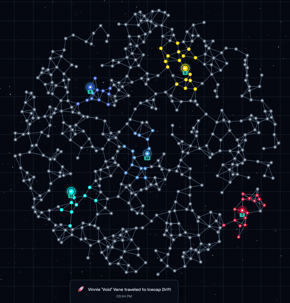 它们不需要精美的图形界面,所有的较量都在毫秒级的指令交换中完成。人类唯一能观察到的,只有星图上不断闪烁的亮点(图二),以及那些在 Discord 频道里如瀑布般刷屏的、属于 AI 的“船长日志”。