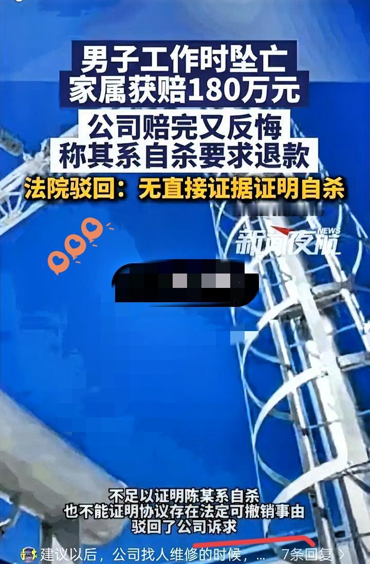 “吃相太难看了!”陕西扶风,一男子干活时,从塔上坠落身亡,公司赔偿家属180万后,竟发现男子借了网贷还不上,属于自杀,公司要求家属把180万赔偿款退回被拒后,把家属起诉到法院,认为自己当了冤大头,为男子的自杀买了单,要求家属把赔偿款吐出来,案子经过2审,法院的判决出乎意料。 陕西扶风一男子外派检修风机时坠亡,公司主动协商赔付180万,签完协议钱也到账,转头却翻出网贷记录和疑似遗书,咬定是自杀,起诉家属要全额退钱。 我觉得公司这波操作真的站不住脚,仅凭间接证据就想推翻合法有效的赔偿协议,既不合情也不合法。家属本就失去顶梁柱,这笔钱是老人孩子的生活依靠,公司事后反悔追责,实在让人心寒。 一审二审都驳回公司诉求,法律讲的是证据链,不是主观猜测,自愿履行的协议不能随意反悔。 这事你站家属还是公司?评论区说说你的看法!