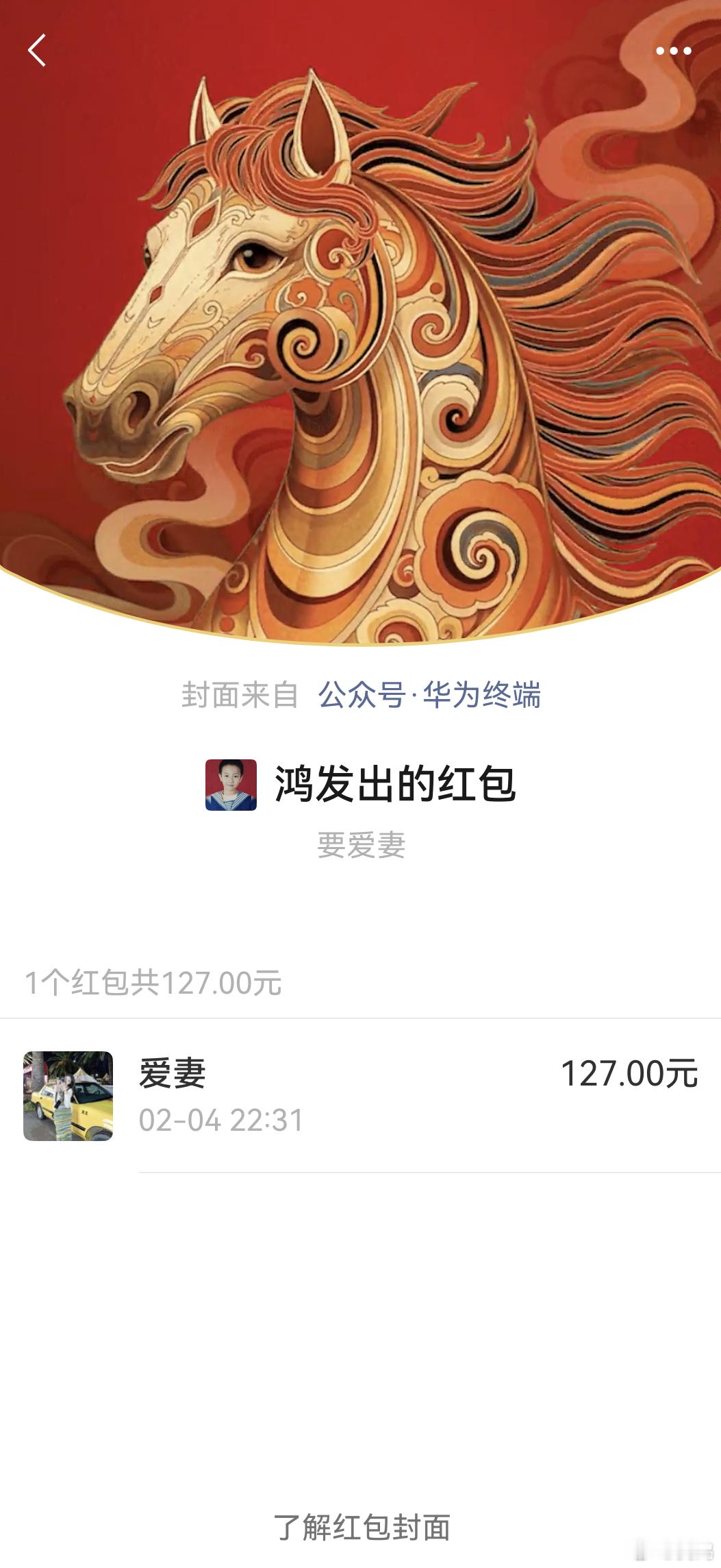 之前我跟爱妻互发红包,我发了127寓意要爱妻,用的华为终端红包封面。她给我发了178寓意要妻发。
