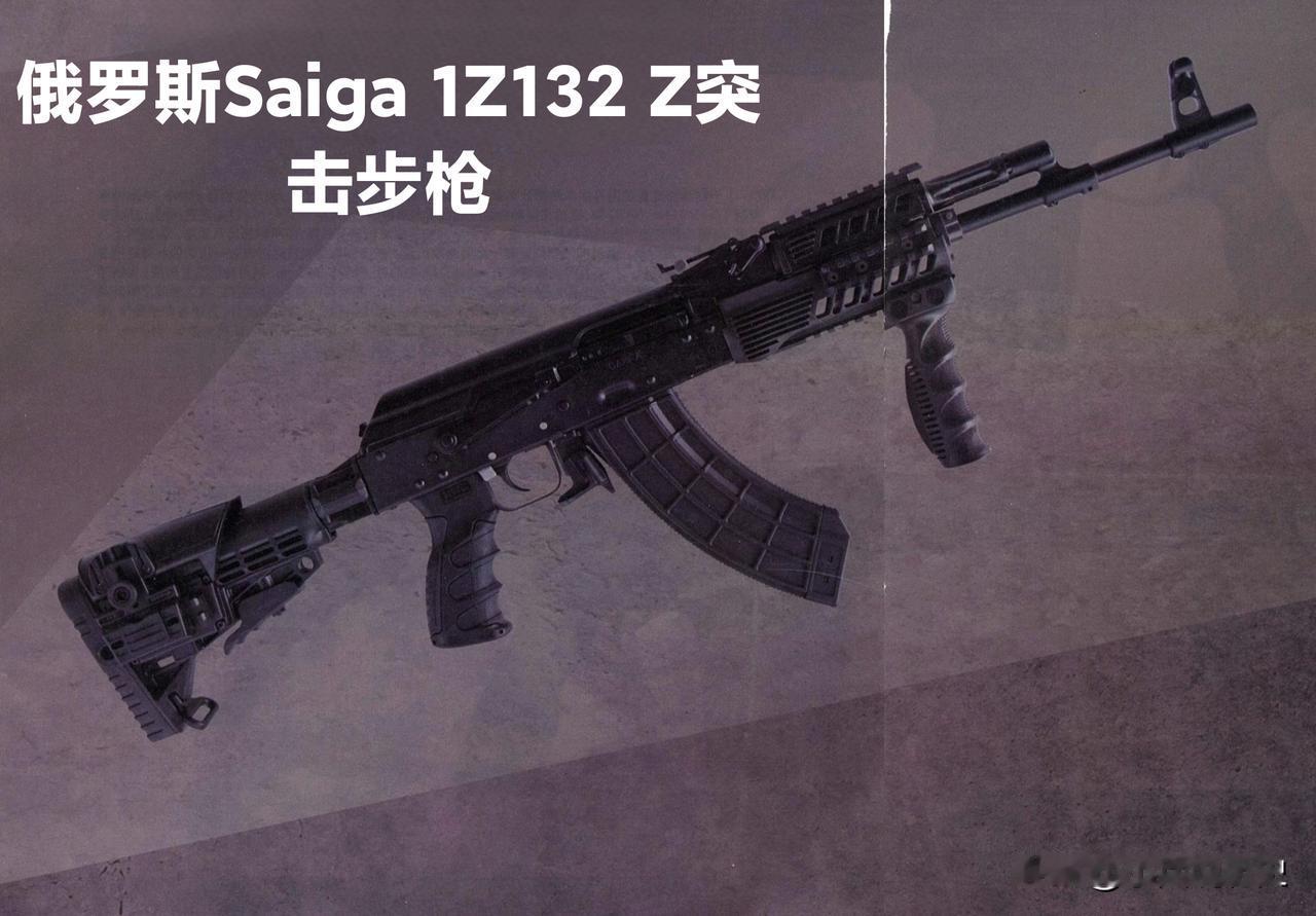俄罗斯Saiga 1Z 132 Z突击步枪 萨伊加1Z 132 Z战术步枪,是俄罗斯伊兹玛什兵工厂打造的一款现代化升级出口款AK系步枪。 这款枪在AK基础上更换了带战术导轨的上下护木,上护木顶端导轨能装光学瞄具,下护木两侧与下方可加装前握把等配件。 托柄、握把与弹夹都使用聚合物材质,托柄采用AR系列可伸缩样式,顶部托腮板高度能自由调节;30发弧形弹夹前后做了防滑处理;弹夹解锁键设在扳机护圈前、弹夹后方,面积较大且两侧突出,左右手都能轻松操作。 它拥有7.62×39毫米、5.45×39毫米、5.56×45毫米三种弹种规格,图中是使用7.62×39毫米 M43弹药的1Z132Z战术步枪。