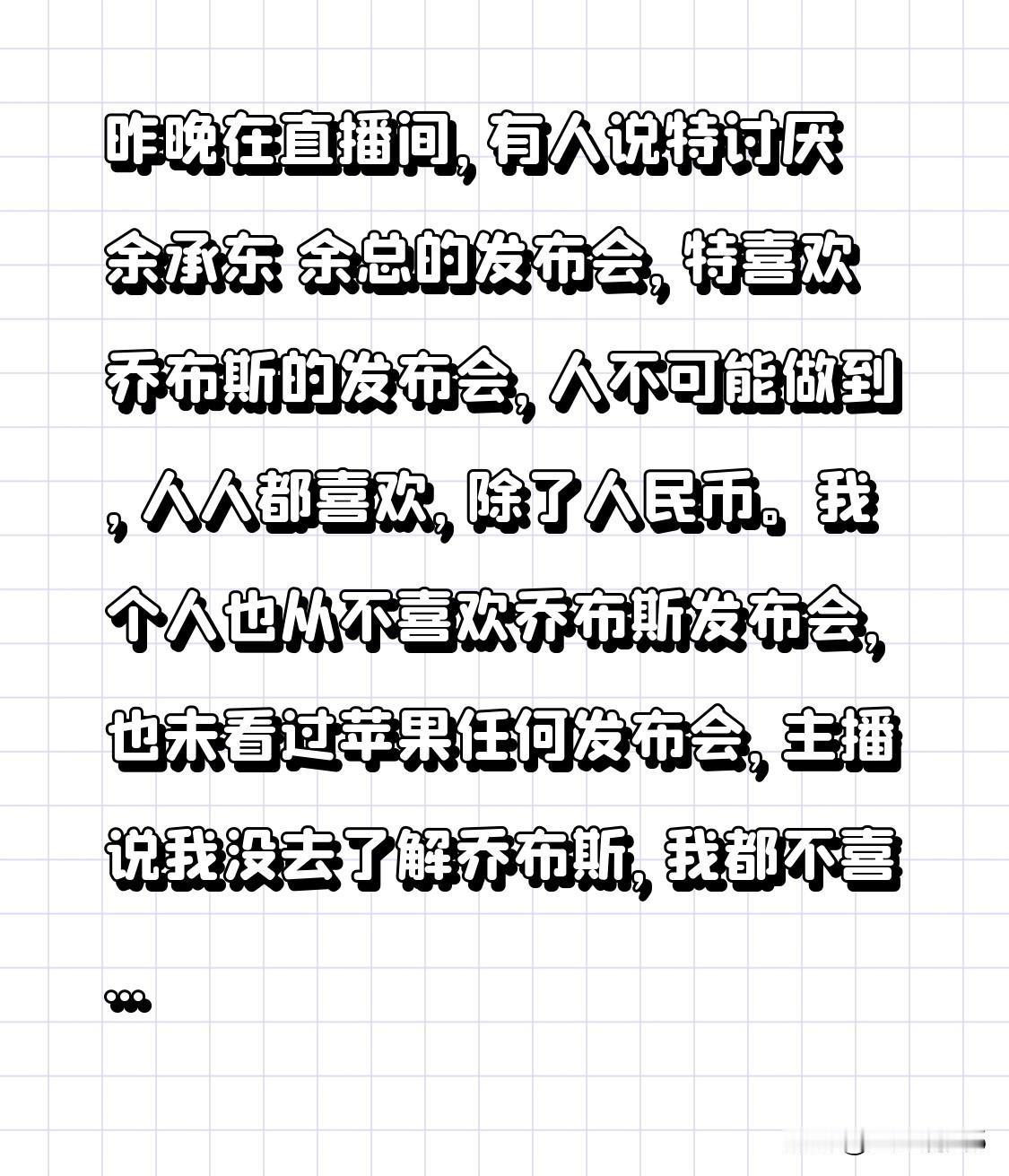 昨晚在直播间,有人说特讨厌余承东 余总的发布会,特喜欢乔布斯的发布会,人不可能做到,人人都喜欢,除了人民币。 我个人也从不喜欢乔布斯发布会,也未看过苹果任何发布会,主播说我没去了解乔布斯,我都不喜欢他了,我怎么去了解。 总之有比对,就会有拉踩,不管是你个人观点,还是还是故意,都离不开拉踩。 连线的说讨厌余承东 余总,其实有千千万万的人喜欢,也有千千万万的讨厌,你说特喜欢乔布斯,其实反过来也一样的。 何必在直播间去拉踩,你说没有拉踩,是你个人的想法和观点,没几人会信你的,不管是乔布斯的粉丝,还是余承东的粉丝。