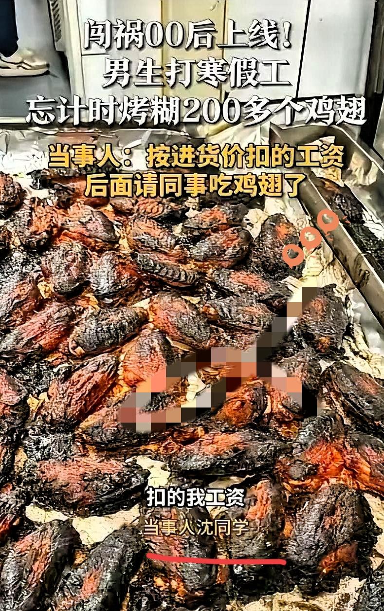 🌙“人能闯多大祸?”山东,一男生趁着寒假去打工,因忘记计时,不小心将200多个鸡翅烤糊,后来这些烤糊的鸡翅,也按进货价从他工资里扣,男生:“钱没挣到,倒是搭进去不少。” 他不是故意的,只是高峰期太忙乱,忘了定时,可损失全压在学生身上,实在有点不近人情。我觉得,生意有风险,店家也该承担一部分经营责任,不能一出事就让兼职者全额买单。 犯错该担责,但扣款也要讲分寸,更要讲温度。这不仅是一次教训,也提醒大家,兼职时再忙也不能大意,更要提前看清规则。 你觉得兼职失误让学生全赔,合理吗?来评论区说说你的看法!