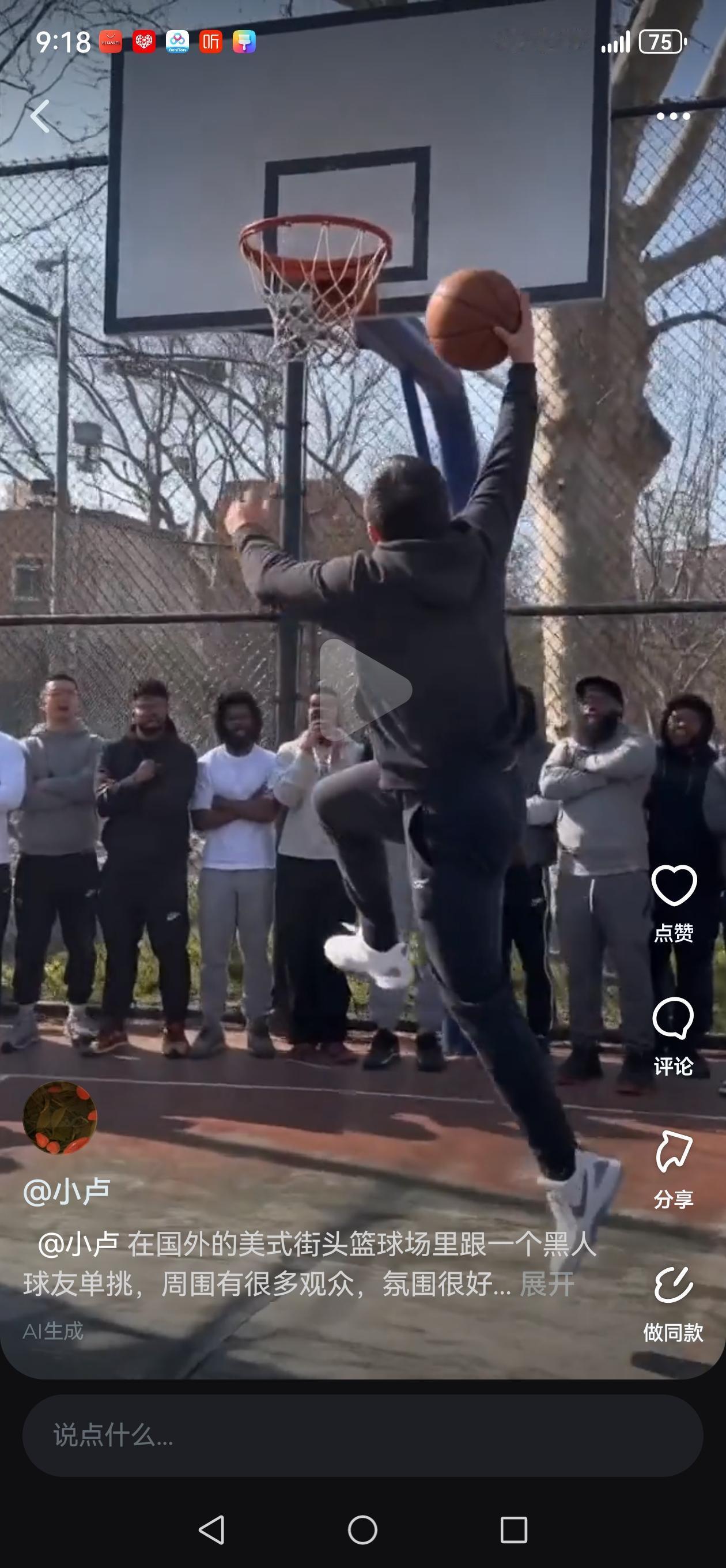即梦新发布的视频模型太强了!我用下面的提示词,生成了一个视频,不要太燃哦! 做导演,当演员不再是梦,你也去试试吧! @小卢 在国外的美式街头篮球场里跟一个黑人球友单挑,周围有很多观众,氛围很好, @小卢 用一记漂亮的变向和胯下过人,过掉防守人后扣篮,震惊四座, @小卢 对着镜头打了个响指,然后用大拇指指腹擦了一下鼻头,大声并骄傲的说:有点料哦,不服你也来!