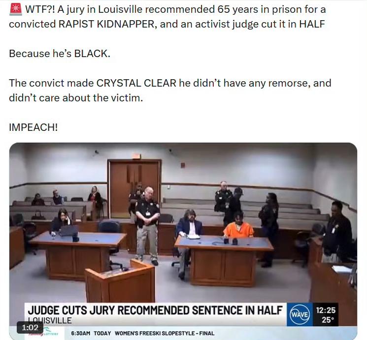 WTF?美国路易斯维尔的一名陪审团建议,对一名被判QJ绑架的罪犯判处65年监禁,但一位左派激进法官却将刑期减半—— 因为他是黑人。 该罪犯明确表示自己没有任何悔意,也不在乎受害者。
