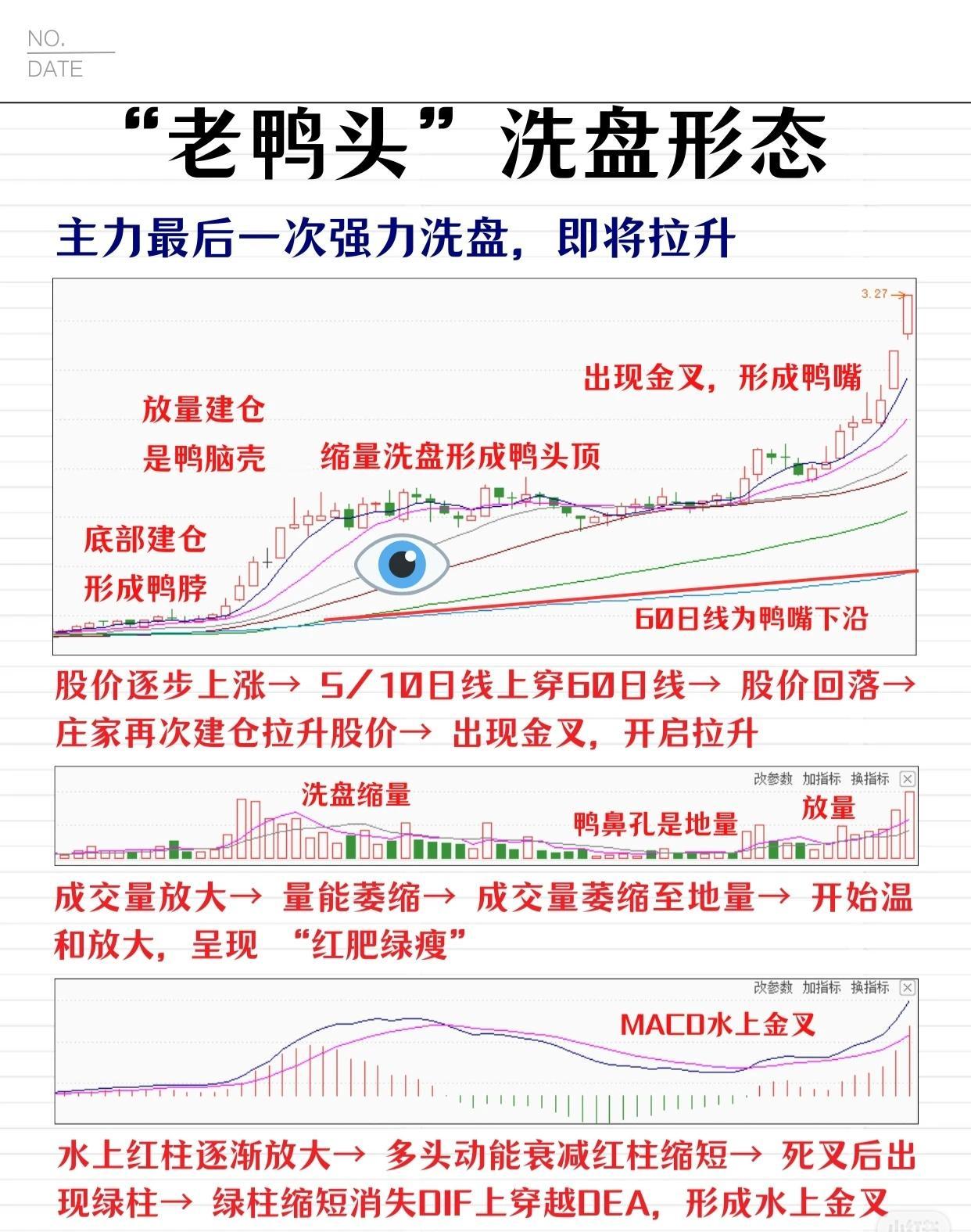 “老鸭头”洗盘形态是主力最后一次强力洗盘,预示即将拉升。其技术特征包括:放量建仓形成鸭脑壳,缩量洗盘形成鸭头顶,底部建仓形成鸭脖,60日线为鸭嘴下沿;股价走势经历上涨、均线金叉、回落再拉升;成交量有放大、萎缩、地量及温和放大的“红肥绿瘦”变化;MACD出现水上金叉。