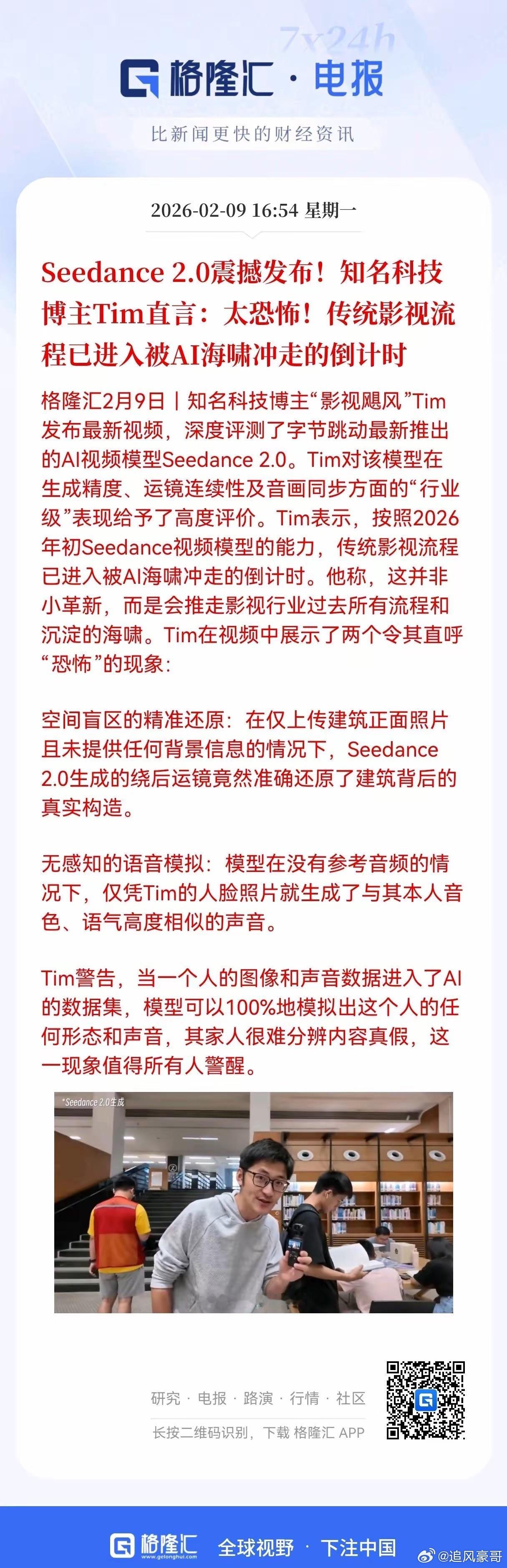 利好!重大利好来了!AI海啸来袭,Seedance 2.0引爆影视革命,三大产业链龙头成资本新宠2026年2月9日,字节跳动旗下即梦AI发布的Seedance 2.0模型,正以摧枯拉朽之势重塑影视行业格局。知名科技博主Tim的评测视频中,该模型仅凭一张建筑正面照就能精准还原背后构造,甚至能通过人脸照片模拟出高度相似的语音,这种“行业级”能力让他直言“传统影视流程已进入被AI海啸冲走的倒计时”。从资本市场投资角度看,这场技术革命绝非概念炒作,而是产业链价值重构的明确信号。算力基础设施作为AI视频爆发的核心支撑,率先迎来确定性机会:浪潮信息作为字节AI算力中心核心服务器供应商,其NF5688M6机型已成为Seedance训练集群的主力设备,随着模型推理需求激增,公司订单排产持续饱满;中科曙光则凭借国产算力龙头地位,为Seedance提供关键算力服务,高算力占比使其受益弹性显著;润泽科技作为字节最大IDC服务商,廊坊智算中心承载着模型训练与推理任务,机柜上架率超95%,GPU用量收费模式将直接推高ARPU值。在应用生态层,与字节深度绑定的内容平台和创意工具商正抢占先发优势。掌阅科技旗下泡漫平台率先接入Seedance 2.0,AI漫剧实现24小时上线,形成“调用费+会员费”的双击收入模型,春节档流量高峰将进一步强化变现能力;德才股份旗下奇想无限与火山引擎共建“漫剧AI工坊”,获得底层模型调用与算力调度支持,B端AI创作场景落地加速;万兴科技则通过深度集成Seedance 2.0插件,让旗下万兴喵影成为创作者的核心工具,创意软件市场份额有望快速提升。更值得关注的是,Seedance 2.0的“声画一体”能力正在重构内容生产与分发链条。网宿科技作为字节CDN核心伙伴,全球2800+节点可支撑AI视频3倍于普通短视频的流量需求,带宽利用率与收入同步提升;蓝色光标等头部营销公司则能通过模型快速生成海量视频广告素材,巩固技术护城河;而中文在线等拥有海量IP的版权方,将在AI短剧爆发中享受“内容变现+版权溢价”的双重红利。随着AI视频从功能型工具向生产级平台进化,资本市场正重新定义影视行业的价值坐标。那些能在算力支撑、生态协同、内容变现三大维度形成闭环的龙头企业,将成为这场“AI海啸”中的最大赢家。
