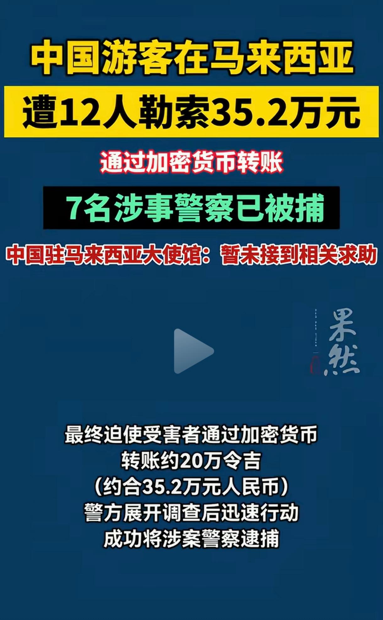 春节将至,出国旅游的,可真的长点心了。 中国游客在马来西亚遭12人勒索35.2万元,通过加密货币转账7名涉事警察已被捕。 我的天呐,中国的游客成了香饽饽了吗?出国旅游也要遭到外国人啃两口?幸亏还将嫌疑人抓获,不知道现金能不能追回来? 即使这样,这7人受到的惊吓,是一辈子的梦魇,他们这辈子还敢再出国吗? 春节将至。出国旅游的,真得长点心,本来花钱旅游开开心心,却花了钱还遭着罪。出国旅游又不是去出国探险,没必要涉险! 一个普通的上班族,肯定不舍得花钱出国旅游,还是老老实实在国内待着吧。安全永远是第一,只要有了安全,才可能做好其他事。没安全,一切都瞎扯。