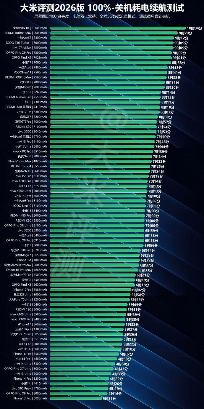 现在安卓有的大电池型号,都玩到10000毫安时电池了,但续航为啥不是还不到5000毫安时电池的iPhone的2倍? 看大米评测这个续航测试,10000毫安时的荣耀win续航时间是10小时04分,4800毫安时电池的iPhone17ProMax续航是7小时32分钟,前者电池是苹果的2倍,但续航也就1.3倍的水平。[灵光一闪] 大家觉得这是为啥?是不是苹果的后台管控更好?硬件耗电更低?