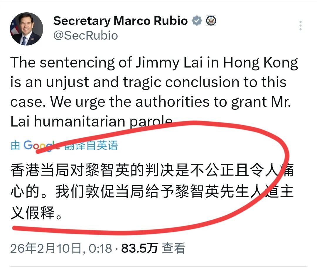 美国国务卿鲁比奥今天(北京时间2月10日)发文叫嚣:“香港当局对黎智英的判决是不