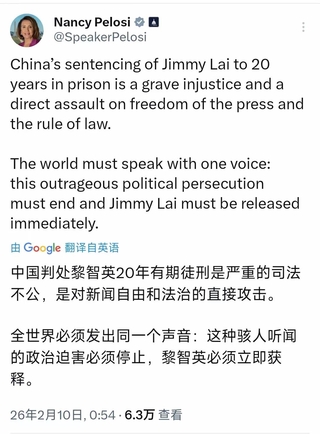 美国国务卿鲁比奥今天(北京时间2月10日)发文叫嚣:“香港当局对黎智英的判决是不公正且令人痛心的。我们敦促当局给予黎智英先生人道主义假释。” 美国前众议长佩洛西今天(北京时间2月10日)发文叫嚣道:“中国判处黎智英20年有期徒刑是严重的司法不公,是对新闻自由和法治的直接攻击。全世界必须发出同一个声音:这种骇人听闻的政治迫害必须停止,黎佩英必须立即获释。” 英国外交大臣2月9日叫嚣:“在一场具有明显政治动机的起诉后,英国公民黎智英今日在香港被判处20年监禁,原因是他行使了言论自由的权利。北京将《国家安全法》强加于香港,旨在噤声对中国的批评。” 甚嚣尘上啊!记得上次如此群魔出动还是黎智英被抓,以及被提起诉讼时这么叫嚣过两次,但是怎么样了哪?起作用了吗?还不是该抓抓该判判了吗?所以,闭嘴吧! 与他们相比,特朗普绝对是一股“清流”:“我知道,很多人都和我说黎是个好人,不过我没有向中方提起这个事的计划,那些都是他们内部的事情。我也不会为此打破这层关系,我认为香港采取了负责任的做法。” 不管是怕说错话把中国惹翻,让他四月份访华一事成为泡影才不得不这么说,但凭心而论,这是特朗普成为美国总统以来说的最为正常,最像人话的一段话。 对我们而言,谁危害了国家安全,谁就会受到惩罚,不管他是谁。而群魔的叫嚣和捶胸顿足说明我们做无比正确!