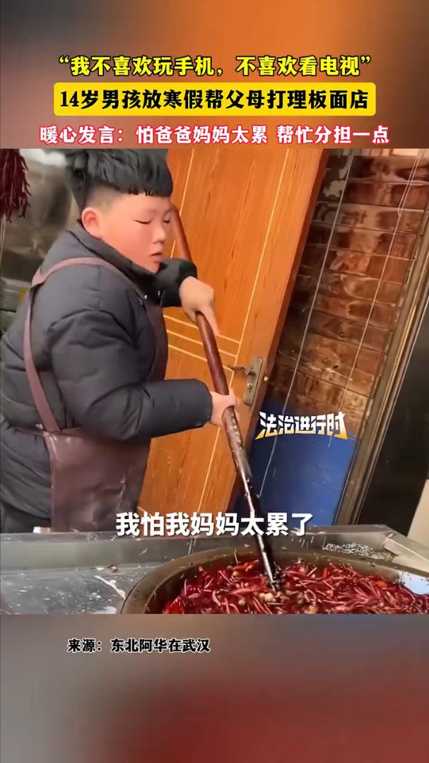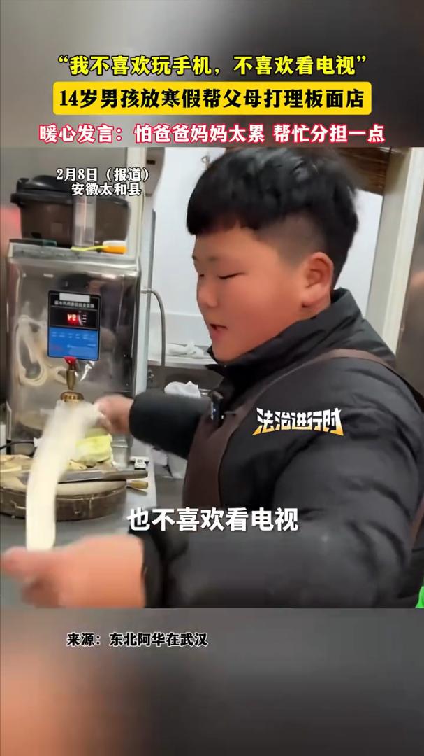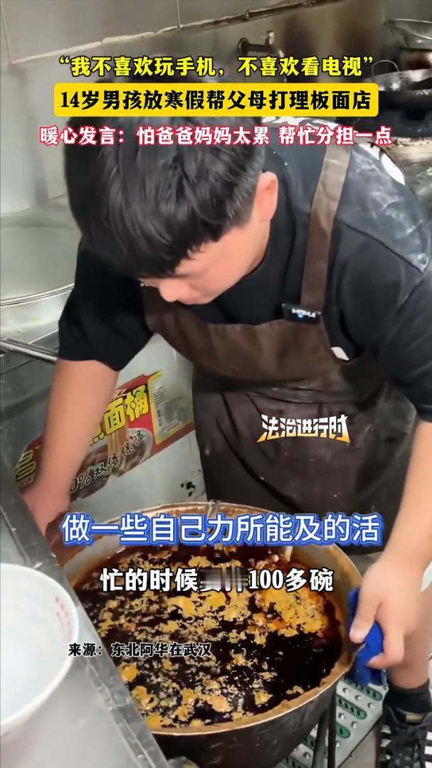 好孩子都是别人家的!安徽太和,14岁男孩放寒假不玩手机不看电视,而是帮爸爸妈妈打理板面店!男孩:那些都太幼稚了,人生要有意义,就想为父母分担一些!网友:为什么优秀的孩子都是别人家的! 14岁男孩放寒假后帮爸爸妈妈料理板面店,这样的日子已经有4年了。小伙子很能干,板面店里的活他样样精通。客人多的时候自己一个人能摔出100多碗的面来。 当别人问起他为什么不像别人家的孩子一样在家打游戏,看电视时,他的回答却很出人意外:我感觉那些都太幼稚了,我长大了要做 一个有用的人。同学们都笑我这样的想法和行为有些傻,但是老师却说我很孝顺,很懂事。我怕妈妈太累了,所以我要帮他们分担一点。 有人将男孩的视频发到了网上,也引发了网友热议,有的网友说,这样的孩子已经超越99.99%同龄人,真是好样的,有这样的儿子是报恩来的,可遇不可求呀! 也有的说,孩子,真为你家人好,把这份心这份努力放到好好学习,长大考公的目标上才是,考了公你才能实现跨越阶层,你父母才能真不那么累,放弃学业真是你做的最错的一个决定。 还有的说,所以这样的孩子就是最优秀的,学习好不重要,三观正努力勤劳。懂得心疼父母,不是总抱怨原生家庭什么托举,这孩子未来一定过得很好,嫁给她的媳妇也会很幸福。 我觉得男孩能出主动帮助妈妈看店,力所能及的帮家人分担,他一定懂孝顺二字的真正含义。大多数人就算活到四十六十也不一定懂! 男孩用自己的行动诠释着对妈妈深深的爱。他没有被同学的嘲笑吓退,也没有被手机诱惑,一心只想着为妈妈减轻负担。 我想不管他的学习如何,他在人生这场考试面前,已经满分!