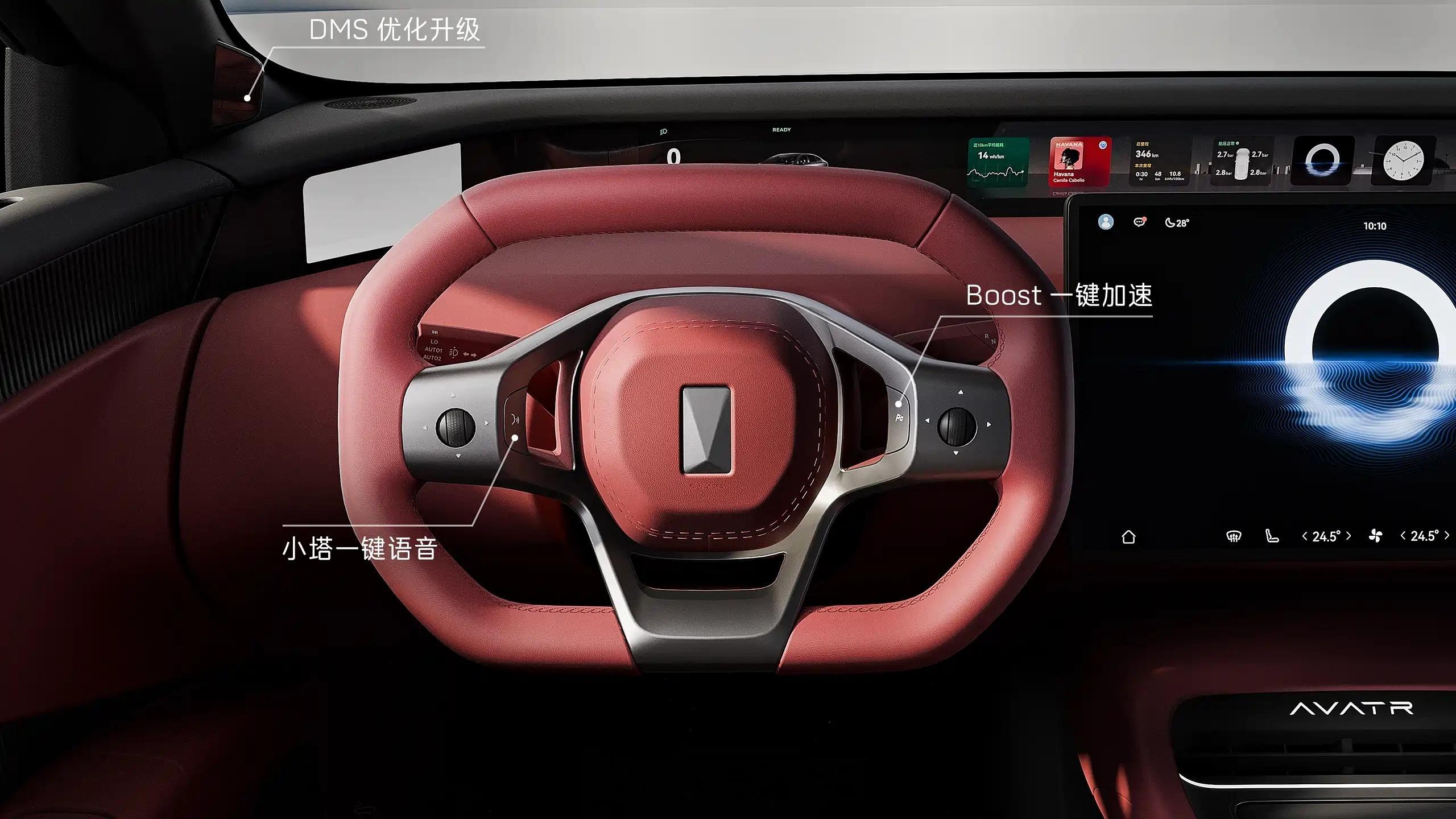 方向盘增加实体按键优化DMS疲劳驾驶预警系统调整门板扶手区域的应急拉手新增车窗开关按键后排增加AVATR MAG连接点