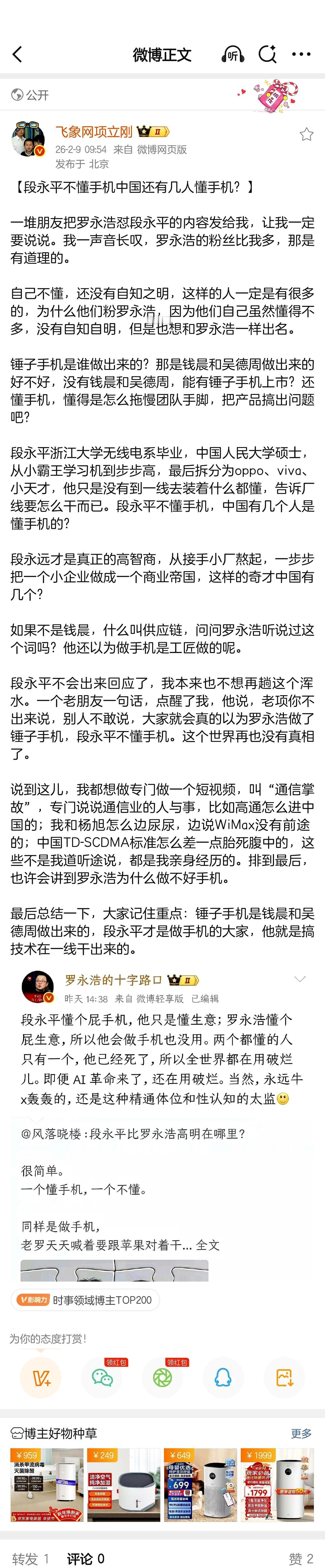 项立刚一回来就把罗永浩按在地上摩擦! 罗永浩碰瓷段永平,说人家“不懂手机”,简直是关公面前耍大刀——段永平从焊电路板干到缔造OPPO、vivo商业帝国,你罗永浩连“供应链”三个字都要靠钱晨教,谁给你的勇气? 这就好比一个刚学会骑三轮车的,去嘲笑开F1赛车的车手不懂怎么压弯。 段永平那是谁? 人称“中国巴菲特”,当年把小霸王和步步高做成国民品牌的时候,罗永浩可能还在新东方背单词。 不管是做实业还是搞投资,段永平的段位都在大气层。 罗永浩觉得段永平不懂手机,大概是觉得段永平不懂怎么在发布会上讲段子,不懂怎么把情怀包装成溢价卖给粉丝。 做手机这行,不是光靠嘴皮子利索就能成的。 供应链管理、库存控制、渠道下沉,这些硬骨头哪一个是靠PPT能解决的? OPPO和vivo能在全球市场杀出重围,甚至在东南亚和欧洲市场占据一席之地,靠的是几十年的技术积累和对市场的敏锐嗅觉。 段永平早就看透了商业本质,人家现在闲云野鹤,手里拿着网易和苹果的股票,每年光分红估计就够罗永浩还一阵子债了。 项立刚这次虽然话说得直白,甚至有点刺耳,但道理是这个道理。 互联网时代确实给了很多人一夜成名的机会,但也容易让人产生幻觉,以为流量就是实力。 罗永浩作为初代网红,口才确实一流,带货能力也强,但在硬核的制造业面前,还得学会保持敬畏。 评价一个行业泰斗之前,最好先看看自己兜里有几把螺丝刀。 别拿无知当个性,商业世界最终讲究的是结果和底蕴,而不是谁嗓门大。
