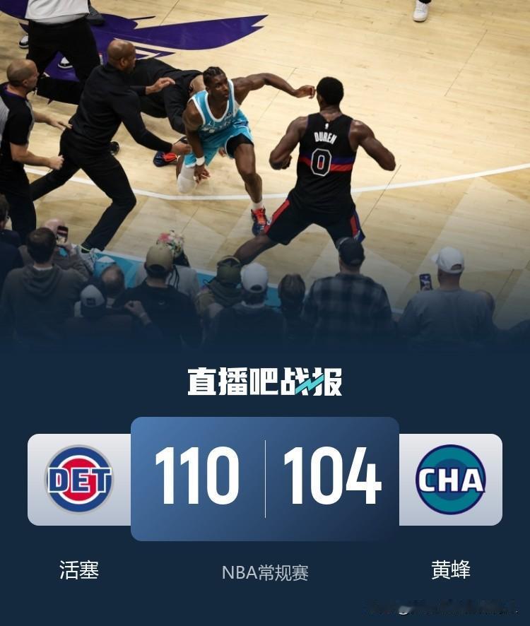 双方爆发大规模冲突,四人被驱逐,活塞客场110:104力克黄蜂稳坐东部第一,距离联盟第一雷霆仅差1胜场,康宁汉姆继续稳定发挥拿到33分9篮板7助攻,罗宾逊10中8得到18分,杜伦得到15分并且遭驱逐,斯图尔特2分被驱逐;黄蜂这边米勒、克尼佩尔、鲍尔三人分别得分20+,迪亚巴特6篮板遭驱逐,布里奇斯得到6分被驱逐,恭喜活塞队取得本场比赛胜利迎来两连胜! nba每日战况 夏洛特黄蜂 底特律活塞 NBA黄蜂队