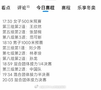 📝女子500米 王欣然(3组)、张楚桐(5组)、范可新(8组)📝男子1000米,刘少昂(3组)、林孝埈(7组)、孙龙(8组)📝男女混合团体接力1/4决赛,中国队、加拿大队、比利时队、哈萨克斯坦队(3组)