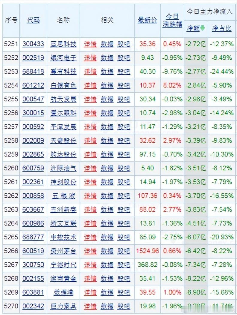 典型个股:遭遇主力:资金撤离。净流出6.07亿元,为当日科创板资金流出第一名,也是沪市流出前三。