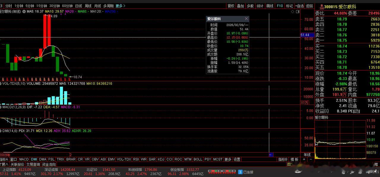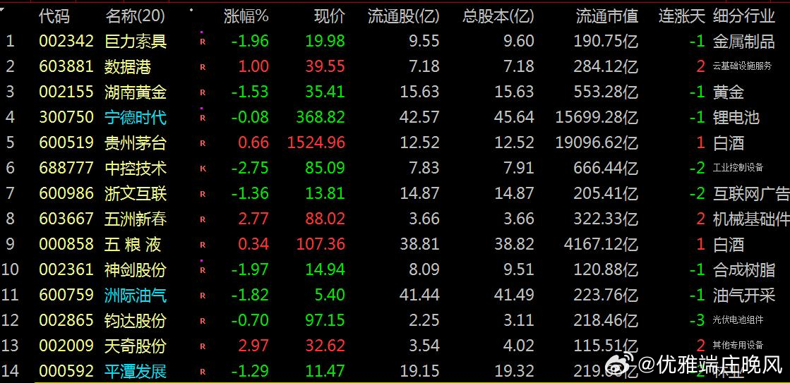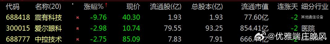 今日午盘:市场数据,强势特征。少数个股:弱不禁风:高位跳水:震有科技、爱尔眼科、中控技术等个股出现大幅下跌,主要受业绩预亏、资金集中流出及市场情绪分化等因素影响,而非单一政策刺激所致。当日市场呈现结构性分化,部分板块如商业航天、AI算力等表现活跃,但上述个股未能跟涨,反而因自身基本面和资金面压力而走弱。今天透视:行业弱股。