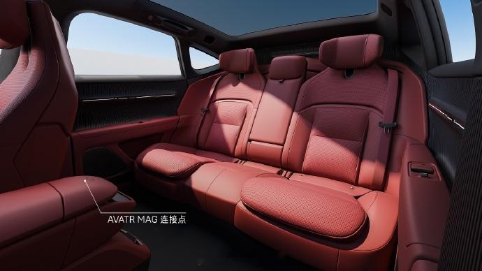 车方向盘采用方形造型设计还挺独特,设置有小塔一键语音按键和 Boost 一键加速,后排扶手箱处还配有 AVATR MAG 连接点