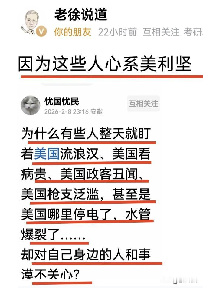 为什么有些人,就盯着美国流浪汉,斩杀线,枪支泛滥,看不起病,萝莉岛政客丑闻,甚至哪里停电,水管爆裂…… 却对身边发生的人和事,漠不关心充耳不闻,只字不提成了哑巴? 京城老徐回答:他们心系美利坚! 苍狼深表赞同,但想加上一句:是否因为这些人的关心揭露与批评,让美帝不断找漏补缺,才有今天的强大呢? …………