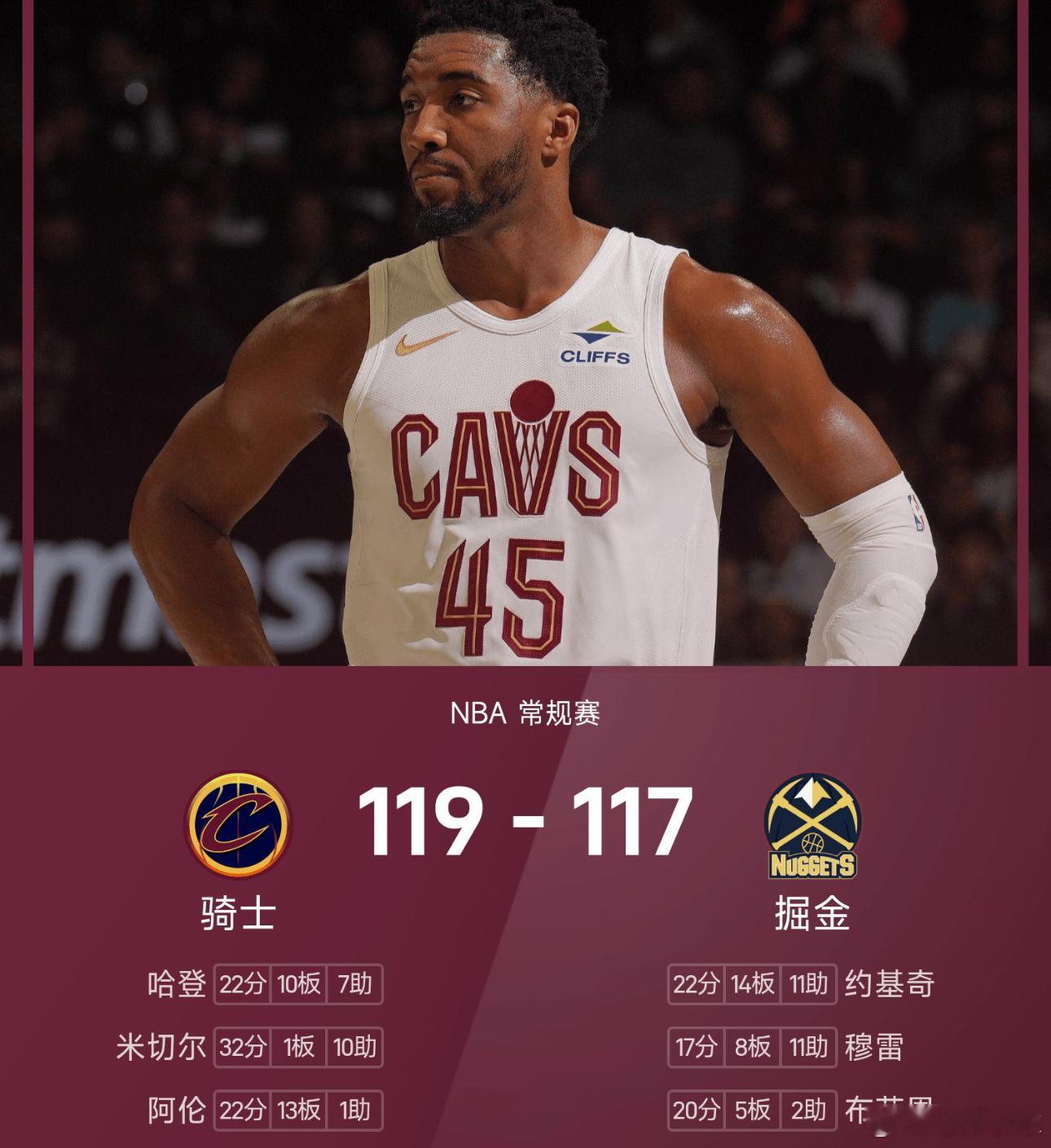 米切尔砍下全场最高的32分1板10助,并且完成罚球准绝杀,率领骑士成功取胜。NBA常规赛骑士掘金