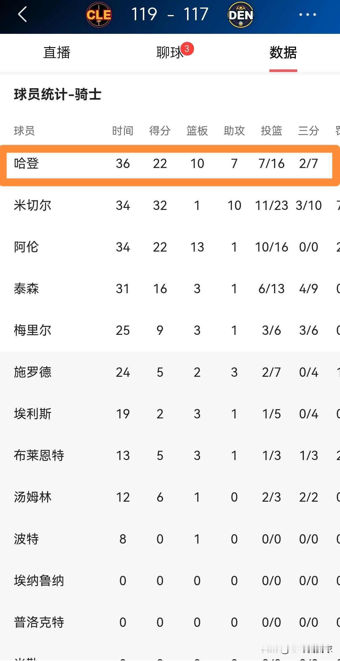 骑士超级球星哈登真是让人赞不绝口!在今天骑士客场以119:117险胜掘金的比赛中,哈登在攻防两端都打出了极具说服力的表现,他是球队能够获胜的大功臣。 全场比赛下来,哈登首发出战36分钟,投篮16中7,其中三分球7中2、罚球6中6砍下22分,外加10篮板7助攻4盖帽,他的场上正负值为+9。 值得一提的是,在第四节比赛的最后时刻,哈登迎着小哈达威的防守投进了一记极其关键的三分球,帮助球队扳平了比分,这才有了米切尔的罚球绝杀。