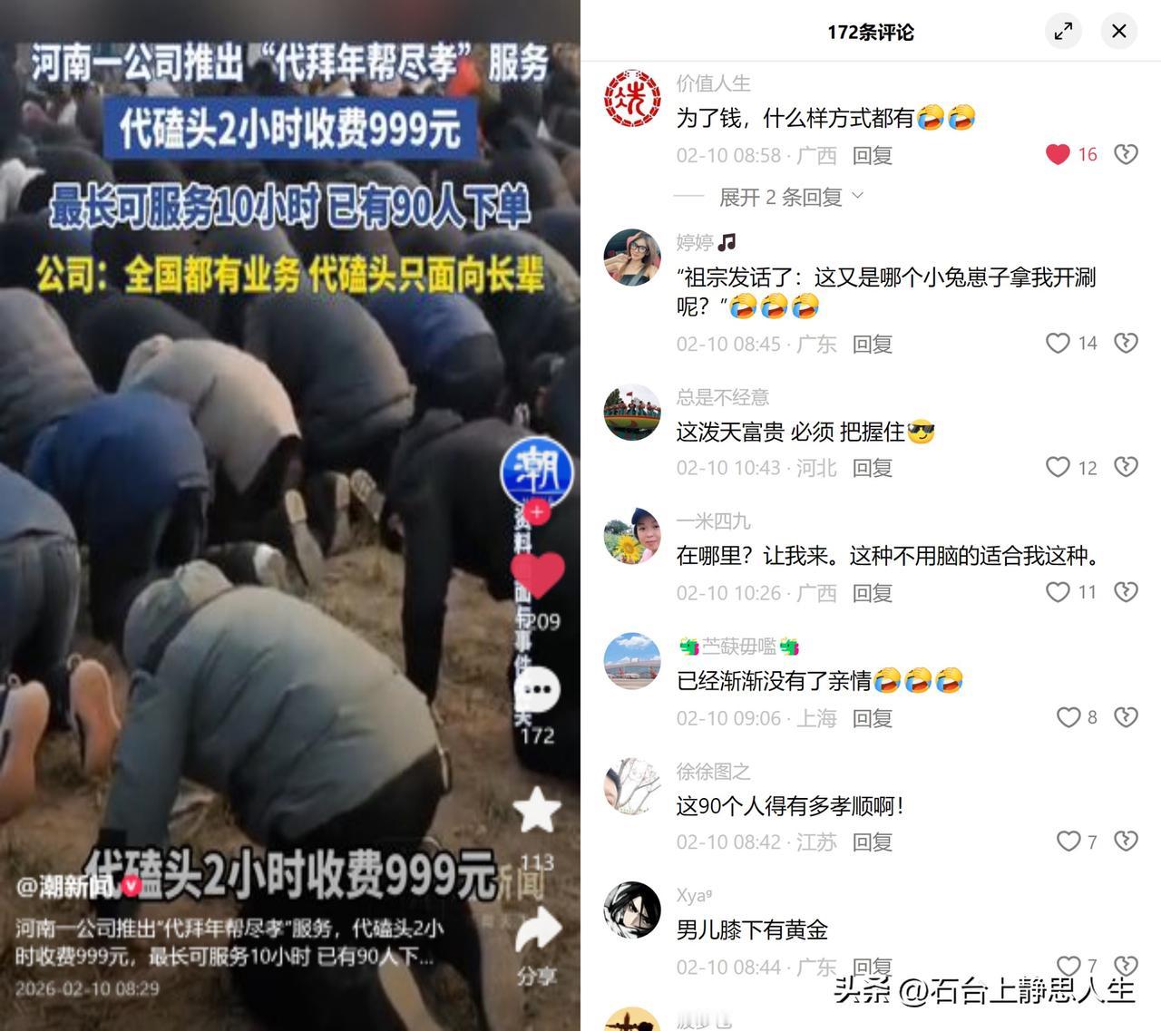 999元代磕头,已有90人下单 最近有跑腿平台推出代尽孝系列套餐,最贵的是两小时999元的代磕头服务,主打帮异地游子、社恐人群完成春节礼仪,争议发酵后已下架相关套餐。 这事儿看着荒唐,背后却是当代人的两难。有人隔着千里回不了家,有人怕应付人情社恐犯怵,商家精准捕捉到这份尽孝焦虑,把本该走心的传统礼仪,拆解成了标准化的可售商品。可磕头本是藏着敬重的仪式,一旦明码标价按流程走完,孝的温度就没了,只剩交易的冰冷。大伙的讽刺和调侃,说到底都是对这种情感商品化的别扭,孝心要是能花钱买,那亲力亲为四个字,又算什么呢? 不知道那90单里,有多少是真无奈,又有多少是图个形式交差?有些心意,从来都没法代付。