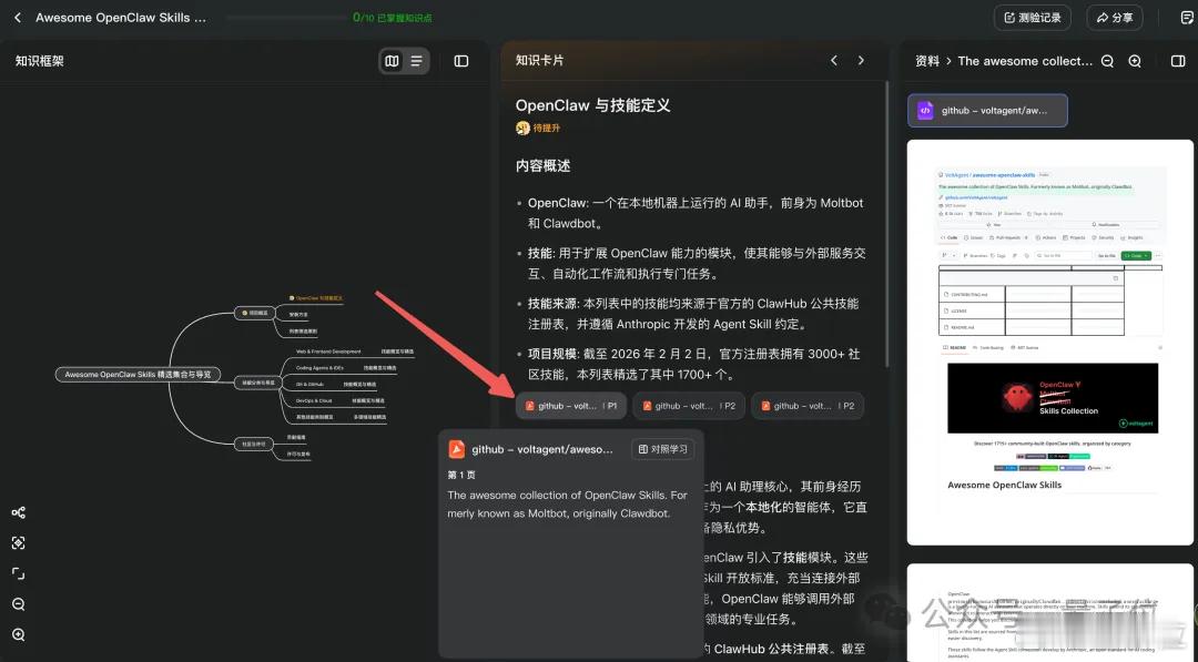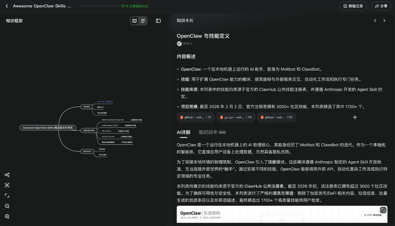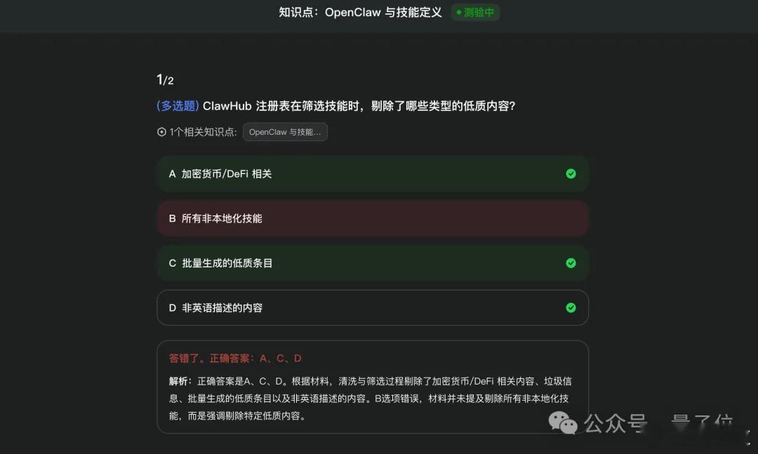在每一个环节过后,还会有一个小测环节,例如它会问你:ClawHub注册表在筛选技能时,剔除了哪些类型的低质内容?