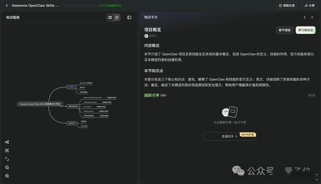 点进去,映入眼帘的,就是一个涵盖10节课的教程,包括对整个OpenClaw的知识框架和知识卡片:【图4】。