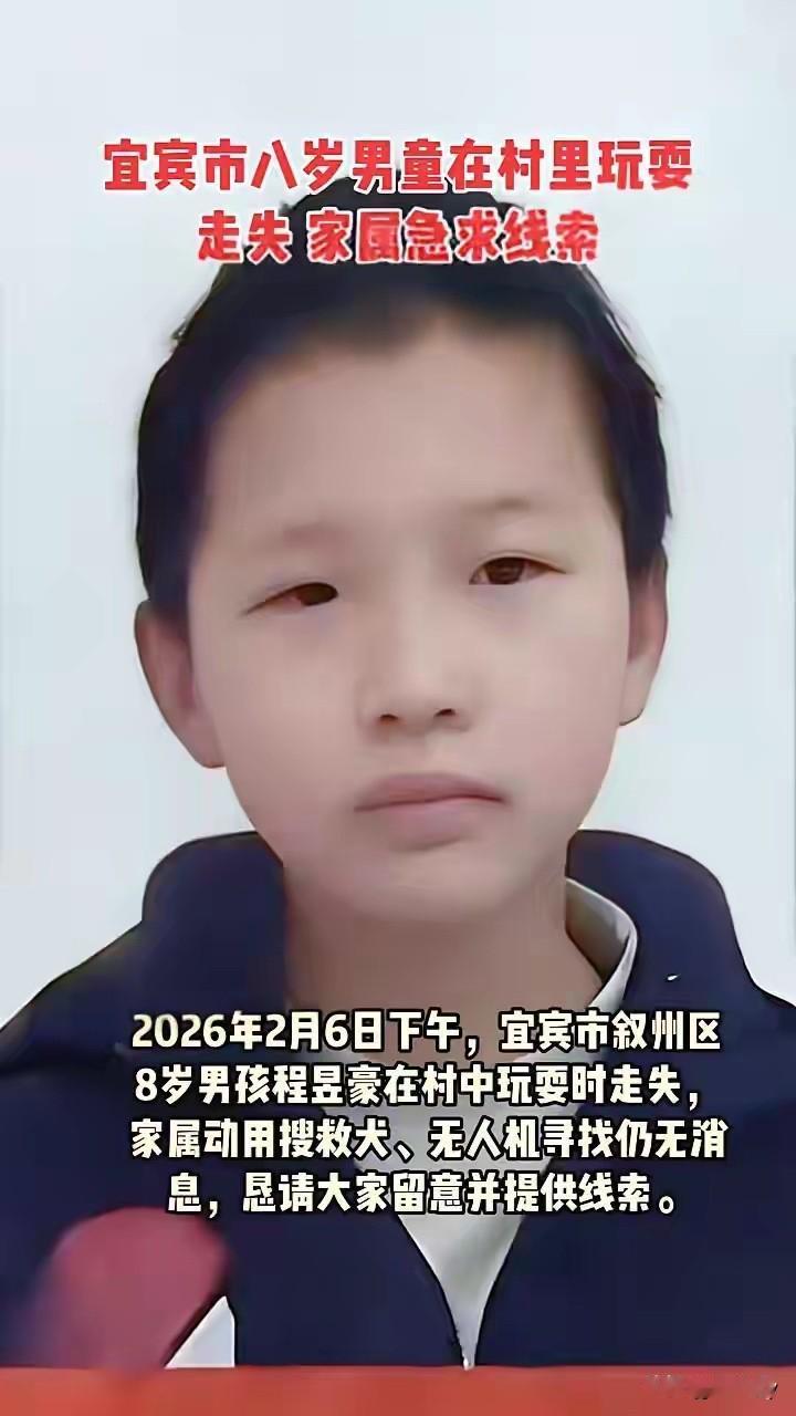 痛心!四川宜宾8岁小男孩豪豪在家附近走失,现在已超过三天的时间!还没有找到! 豪豪的奶奶说2月6日下午3点钟左右,小孙子在家门口玩耍,她看孩子一个人挺乖就去洗衣服了,洗完衣服又去干了别的事情! 直到晚上6点钟天都黑了,还没有看见孩子回家,于是奶奶赶紧出门去找,发现孩子已经不在那个地方玩耍了,四处寻找无果后赶紧报了警! 当晚警方和村民在村子附近帮忙寻找,7日警方又动用了无人机和搜救犬,但是都没有找到孩子! 豪豪奶奶说孩子的父亲几年前去世,孩子的母亲身体不好常年住院,八岁的小孙子就一直是爷爷奶奶在照顾! 豪豪今年上一年级,他的视力特别不好属于弱视!看不清书本上的字!但是远处的路和山他都能看清楚! 当地的气温比较低,晚上只有六度左右,奶奶特别担心孩子晚上会很冷,更担心孩子没有出过远门如果发生什么事怕孩子应对不了! 可怜的孩子命太苦了!你在哪里?赶紧回家吧!爷爷奶奶和妈妈都在等着你回家过年!全网的人都在祈祷希望你平安回家!