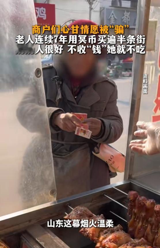 山东枣庄,一老人去买东西时,疑似精神有问题,竟然用冥币付钱,没想到摊主从容收下,让她白拿几串,有人让他把冥币扔掉,觉得不吉利,可老板却表示,老人给什么都没事,他不惧阴阳!网友:以后肯定发财 ! 在山东枣庄的一条小吃街上,在饭点总能看到一位步履蹒跚的七旬老人,她的穿着有些破旧,精神状态也不太好。   她已经在这条街上待了七年,这七年里,她买东西的时候,递出去的“钱”,五花八门什么都有。   有时是一张普通的卡片,有时是孩子玩剩下的玩具,偶尔甚至会拿出冥币,可不管她递过来的是什么,这条街上的摊主们,从来没有拒绝过她。   最早开始照顾老人的,是街上的烤串摊主刘先生,七年里,他见证了老人的每一次到来,也一直默默配合着老人的“交易”。   刚开始的时候,老人来到他摊位前,尽管买东西只拿出来1块钱,但毕竟是真的,到后来,老人实在是没钱,拿来的就是玩具卡,冥币什么的了。   刘先生看到老人精神状态不好,,想着不收她的钱,可老人却执意不肯要,只要刘先生不收她递过来的“钱”,她就会转身就走,宁愿饿肚子,也不愿意白拿别人的东西。   没办法,刘先生只能顺着老人的心意,每次都笑着接过她手里的“钱”,假装当真钱收下,再赶紧递上几串热腾腾的烤串,看着老人满意地离开。   刘先生的举动,慢慢被街上其他摊主看在了眼里,大家没有多说什么,却都悄悄跟着做了起来。   久而久之,这条街上的所有摊主,都形成了一种默契,大家都知道这位老人的特殊情况,也都心甘情愿地照顾着她。   有人曾经劝过刘先生,说老人递过来的冥币太不吉利,让他赶紧扔掉,别留在摊位上。   可刘先生却笑着说,没什么吉利不吉利的,老人人很好,也没有什么坏心眼,她只是想凭着自己的“钱”买东西吃,不收下她的“钱”,她就不肯吃东西,自己这么做,也只是举手之劳。   刘先生总说,自己没做什么大事,比起其他摊主,他做得还不够多,整条街的人,都在默默帮助这位老人。   七年时间,老人几乎每天都会来这条小吃街,每天都会收到摊主们的善意,从来没有被驱赶过,也从来没有被冷落过。   摊主们的善意,从来都不是轰轰烈烈的,也从来没有谁刻意去宣扬,他们只是在自己的摊位前,用最朴素、最平凡的方式,守护着这位要强的老人。   他们不会刻意去纠正老人的行为,也不会用怜悯的眼光看待老人,只是顺着老人的心意,满足她“付钱买东西”的小小执念,守护着她最后的尊严。    这条平凡的小吃街,因为这群善良的摊主,因为这份默默的守护,多了一份不一样的温暖。   没有人觉得麻烦,也没有人抱怨过一句,大家都只是做着自己力所能及的小事,却汇聚成了一股温暖的力量,守护着这位特殊的老人,也温暖着整条街。   这份温暖从来都不是一个人的功劳,不是只有烤串摊主刘先生的善意,而是这条街上所他们都是最平凡的人,用最朴素的善意,做着最温暖的事,默默守护着一位与自己毫无血缘关系的老人。