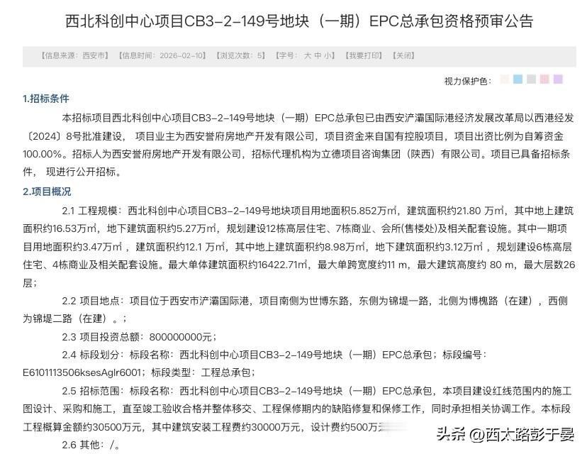 总投资8亿!西安浐灞重磅新盘来袭,西北科创中心一期正式招标 西安楼市又传来重磅消息!西北科创中心项目CB3-2-149号地块(一期) EPC总承包资格预审公告正式发布,意味着浐灞国际港即将迎来一个全新的大型居住社区。 项目坐落于西安浐灞国际港,南侧紧邻世博东路,东侧为锦堤一路,周边道路正在逐步建设完善,未来出行十分方便。整个项目总投资高达8亿元,规模相当可观。 整体项目用地面积约5.85万㎡,总建筑面积约21.8万㎡,规划建设12栋高层住宅、7栋商业、会所及各类配套设施,是一个集居住、购物、休闲于一体的综合性大盘。 本次率先开建的一期工程,占地面积约3.47万㎡,建筑面积约12.1万㎡,将建设6栋高层住宅、4栋商业及配套。建筑最高约80米,共26层,户型和社区规划都比较贴合现代居住需求。 随着项目正式启动招标,离开工建设又近了一步。未来建成后,不仅能为片区提供大量优质住房,还能补齐商业配套,提升周边居住氛围和生活便利度。 浐灞国际港发展越来越快,你看好这个新板块吗? 西安城建 浐灞国际港 西北科创中心