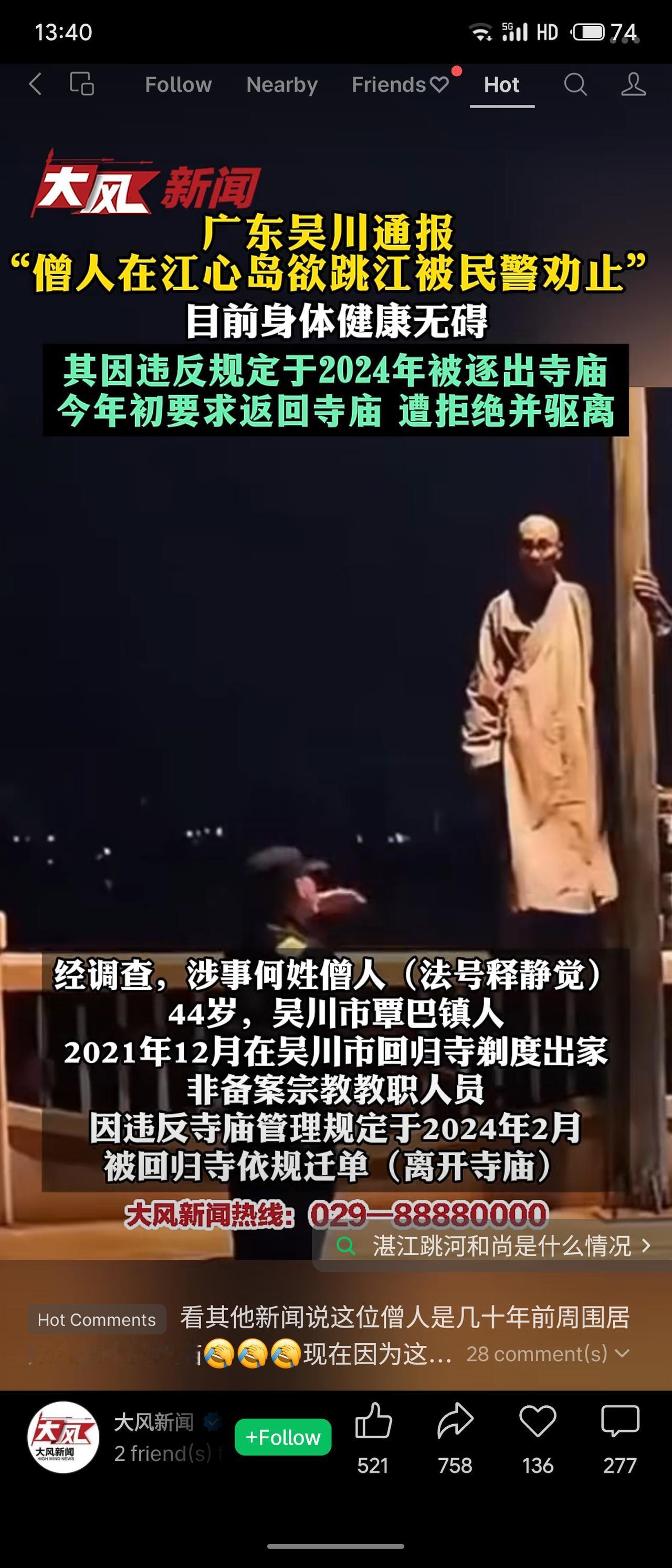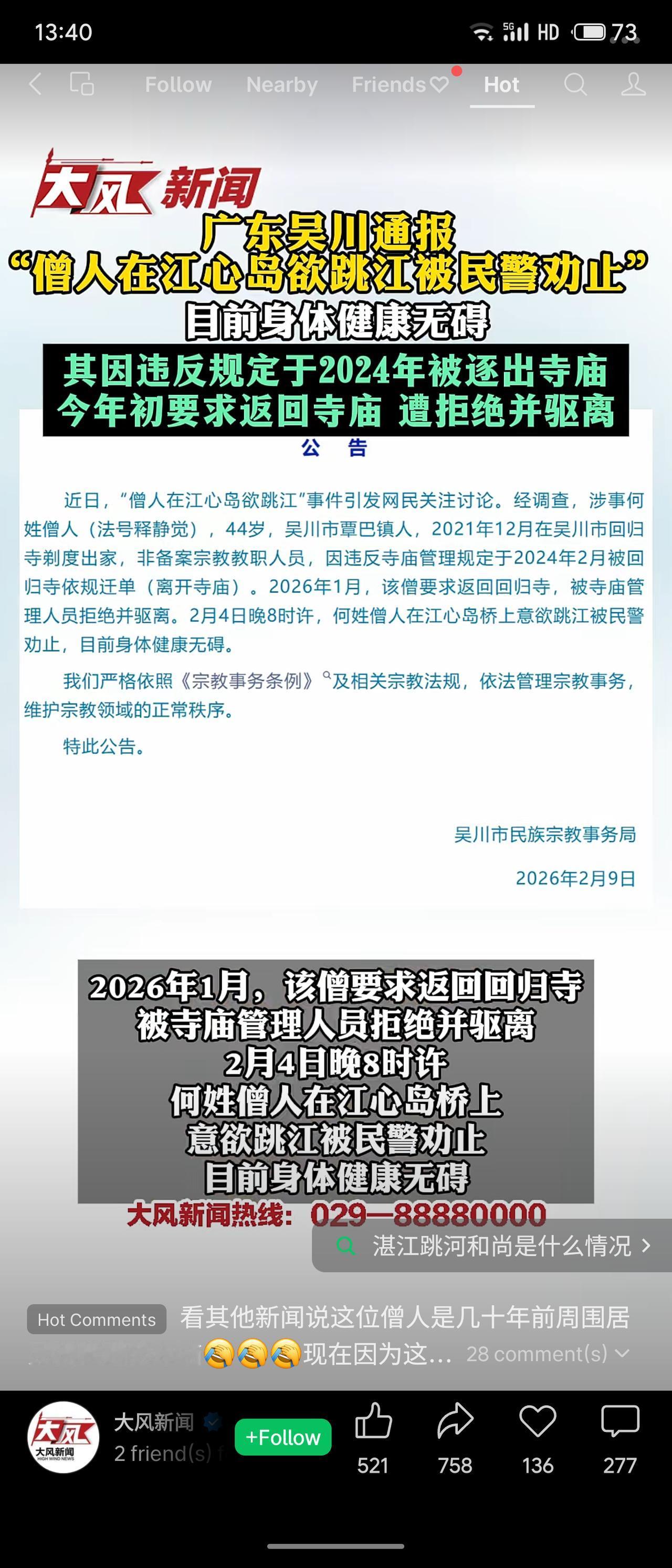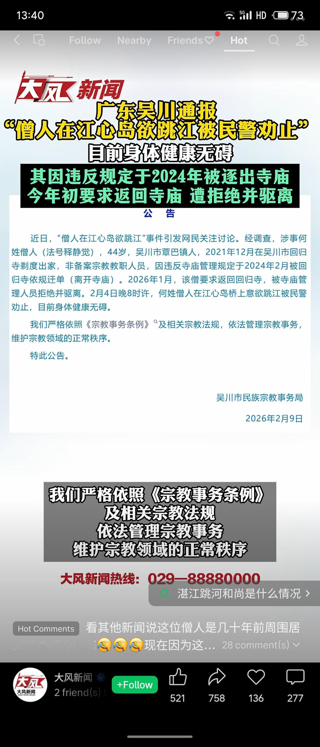 广东吴川市通报,44岁僧人释静觉(非备案教职人员)因违反规定于2024年被回归寺迁单。2026年1月其要求返回被拒,2月4日晚在江心岛意欲跳江,被民警劝止后身体无碍。官方强调依法管理宗教事务。 事件折射出宗教场所规范管理与个体归宿间的矛盾。官方回应及时,但需关注边缘宗教人员的疏导与安置,避免类似极端情况发生。