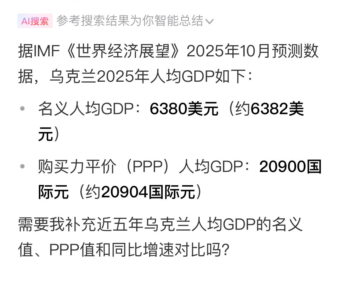 俄乌战争马上就要打满四年了,战争残酷而又漫长。 这对两国的经济是巨大的考验。 《华盛顿邮报》报道说,商界人士认预计,未来三到四个月俄罗斯很可能发生金融危机。 那么乌克兰经济状况又如何呢? 战争爆发前2021年,乌克兰人均GDP是4775美元。 2025年乌克兰人均GDP6380美元,增长了33.61%。 本来觉得乌克兰在俄军的狂轰滥炸下,经济已经千疮百孔,奄奄一息,没想到经济还大幅度增长了。 现在乌克兰有能力生产700万架无人机,乌克兰每天消耗1万架,每年还有300万架结余,这些无人机都是经过战争检验的有效家伙,乌克兰要大力出口,换取外汇,购买军火,发展自己的国防工业。逐步减少对外部的依赖。 俄罗斯要顿巴斯,乌克兰不愿意放弃领土。 这个矛盾真是无解。