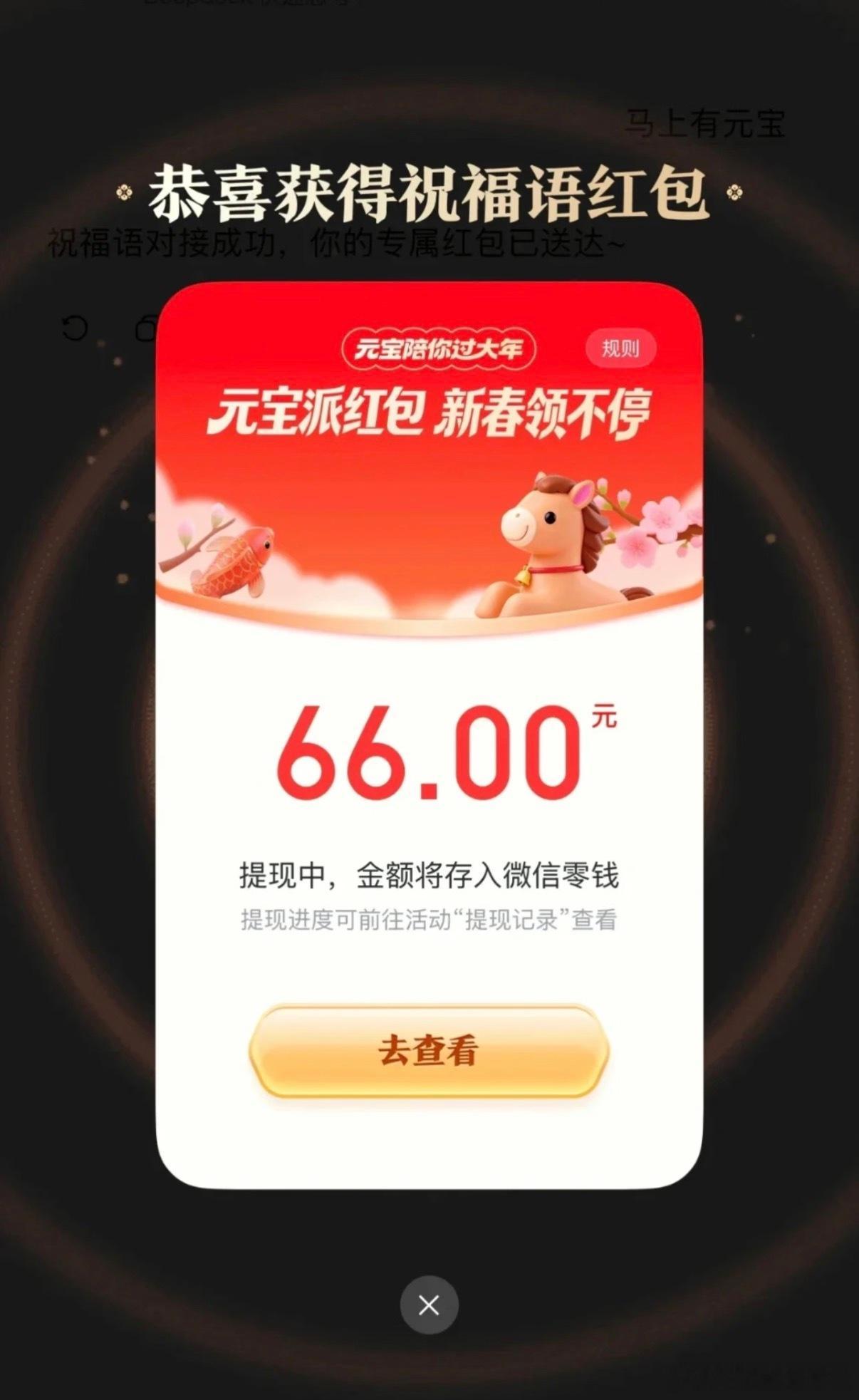 刚才试了试,还真有红包啊,目前见过最大的就是66元,你们得到多少?元宝微信发红包