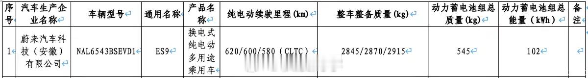 蔚来ES9续航里程信息曝光,从申报信息来看,新车搭载102kWh动力电池,CLTC纯电续航里程分别为580km、600km和620km。