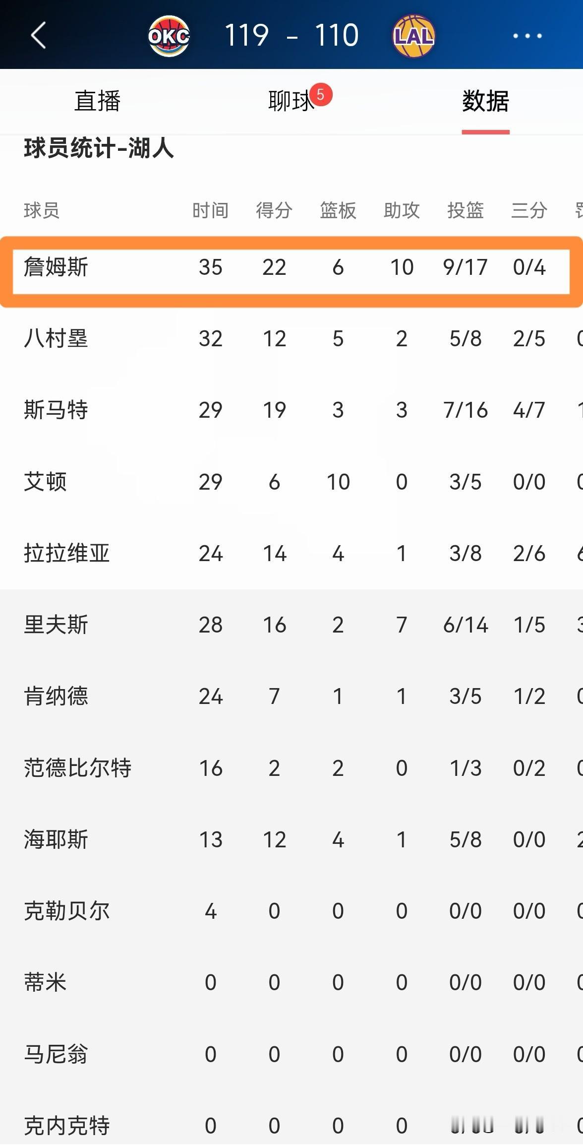 湖人巨星詹姆斯又一次赢了数据输了比赛!虽然今天湖人在主场以110:119不敌雷霆,但是詹姆斯却收获了非常漂亮的数据。 全场比赛下来,詹姆斯首发出战35分钟,投篮17中9,其中三分球4中0、罚球6中4砍下22分6篮板10助攻1抢断。 坦白说,考虑到詹姆斯已经41岁了,因此22分6篮板10助攻1抢断的数据已经足够漂亮了。