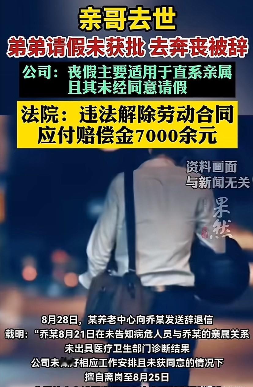 “令人寒心!”北京,男子得知亲哥哥病危,想请个假好好陪陪哥哥,结果却遭到了领导的拒绝。次日,在得知哥哥已经去世后,来不及多想,给领导再次发了个请假信息便连忙赶回老家,结果返岗途中被领导告知,已经因为擅自离岗而被开除。男子寒心不已,与公司理论未果后,认为公司系违法解除劳动合同,一纸诉状将公司告上法庭,要求公司支付双倍经济补偿金。法院判决令人大快人心! 2023年8月,北京的暑气还没散尽。刚办完丧事、满身疲惫回到北京的厨师乔某,手机屏幕突然亮了。 发信人是后厨经理高某,内容短得像一把刀:“下周一找我写辞职信,明天不用进公司。” 屏幕这头的乔某愣住了。就在几天前,他还在为亲哥哥的病危焦头烂额,而此刻,这行冰冷的指令成了他入职这家养老中心5个月后的“最终判决”。 这行字的代价,最终被定格在7000余元。这是法院判决公司必须支付的“违法成本”。但这笔钱的意义,远不止是补上了乔某一个月的工资,它强行拉平了“公司硬制度”与“传统人伦”之间巨大的温差。 把时间轴拨回2023年8月19日。乔师傅正在忙碌时,家中突然传来消息,说他的兄长病情危急。 兄弟俩从小一起长大,这份感情不需要多解释。乔某得知情况后,第一时间找到部门负责人高某,向其提出申请,希望能获批十五天的假期。高某的回复很职业,也很机械:“权限不够,批不了。” 乔某急了,退了一步说:“不要工资行不行?”得到的答案依然是拒绝。那一刻,企业的管理系统像一台精密的机器,自动过滤掉了“员工哥哥病危”这个非标准参数。 事情在次日急转直下。8月20日,哥哥去世的噩耗传来。一边是只能批给“父母配偶子女”的死板规定,一边是无法重来的最后一面。 乔某没再纠缠,给高某发了一条请假信息,没等回复便强制离岗,跳上了回乡的列车。在管理者眼里,这叫“先斩后奏”。在乔某心里,这是为人弟者的本能。 就在乔某回乡奔丧的这几天,公司的HR系统开始冷酷运转。8月25日,一纸辞退决定生成,2025 年 8 月 28 日乔某收到公司辞退信,理由无懈可击:未按规定请假、擅自离岗、严重违反规章制度。 等到乔某办完后事,想回公司继续干活时,那扇门已经对他关上了。 法庭上的交锋很有意思。养老中心的法务团队抛出了一个合法的逻辑盾牌:根据旧有的相关规定,法定丧假确实仅针对直系亲属。在公司的KPI考核表里,“哥哥”被排除在“必须悲伤”的名单之外。 法官面临着一个逻辑悖论:从《劳动法》的角度看,乔某确实违纪了。没获批就走人,这是职场大忌,按规则开除似乎没毛病。 但法律的高明之处,在于它不仅仅是冷冰冰的条文。法院在这里引入了更高维度的《民法典》原则——“公序良俗”。 判决书的逻辑很透彻:乔某虽然程序违规,但这属于“小错”。而奔丧是中华民族几千年的传统人伦,是最大的“情理”。 企业制定内部管理规则,应坚守合理边界,不能违背公序良俗与基本人情,更不能忽视劳动者应有的人格尊严与正当权益。 制度的初衷是规范秩序、保障双方,而非以严苛条款损害基本情理,唯有兼顾法理与人情,才能真正实现公司机械地利用规则阻碍员工尽孝悌之道,且事后直接处以“开除”这种极刑,属于滥用管理权。 这笔最终确定的7000余元补偿款项,本质上是一笔清晰可算的经济账目。乔某2023年4月8日入职,8月被辞,工龄不满半年。按《劳动合同法》规定,经济补偿算半个月工资。 既然是“违法解除”,公司就得付双倍赔偿,也就是一个月的工资。这笔钱,既是乔某一个月的汗水,也是法律给“冷血管理”开出的一张罚单。 最讽刺的是,涉事的单位是一家养老中心。一家本应深谙生命冷暖、重视人文关怀的机构,在员工遭遇亲人离世的悲痛时刻,却采取了冷漠生硬的处理方式,寒了人心,也与其应有的温度与担当相去甚远。 这张判决书其实是在提醒所有管理者:制度是死的,写在纸上。但执行制度的人是活的,活在人情里。当管理失去了人味儿,再严密的规则也只是一纸空文。 参考信息:亲哥去世员工请假奔丧被辞,法院:违法解除劳动合同!公司赔偿7000余元 2026-02-09 18:56·观威海