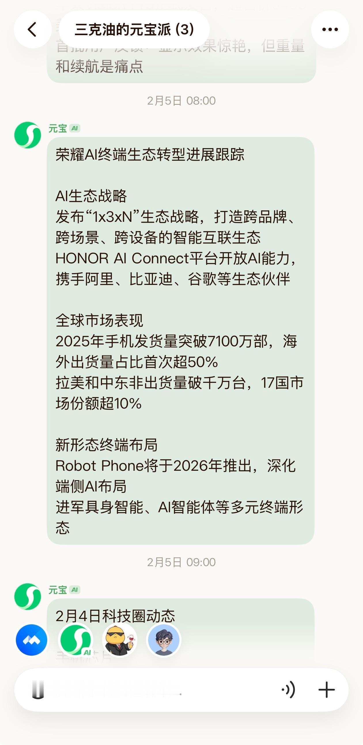 我就随便设置了一下,让它每天给我准点发送昨日科技数码相关新闻和荣耀相关内容。科技新闻除了有标题,没啥内容。荣耀相关内容翻来覆去就那点,没有时效性,2月4日还在推送几个月前的内容,找不到昨天有内容直接说没有不就行了