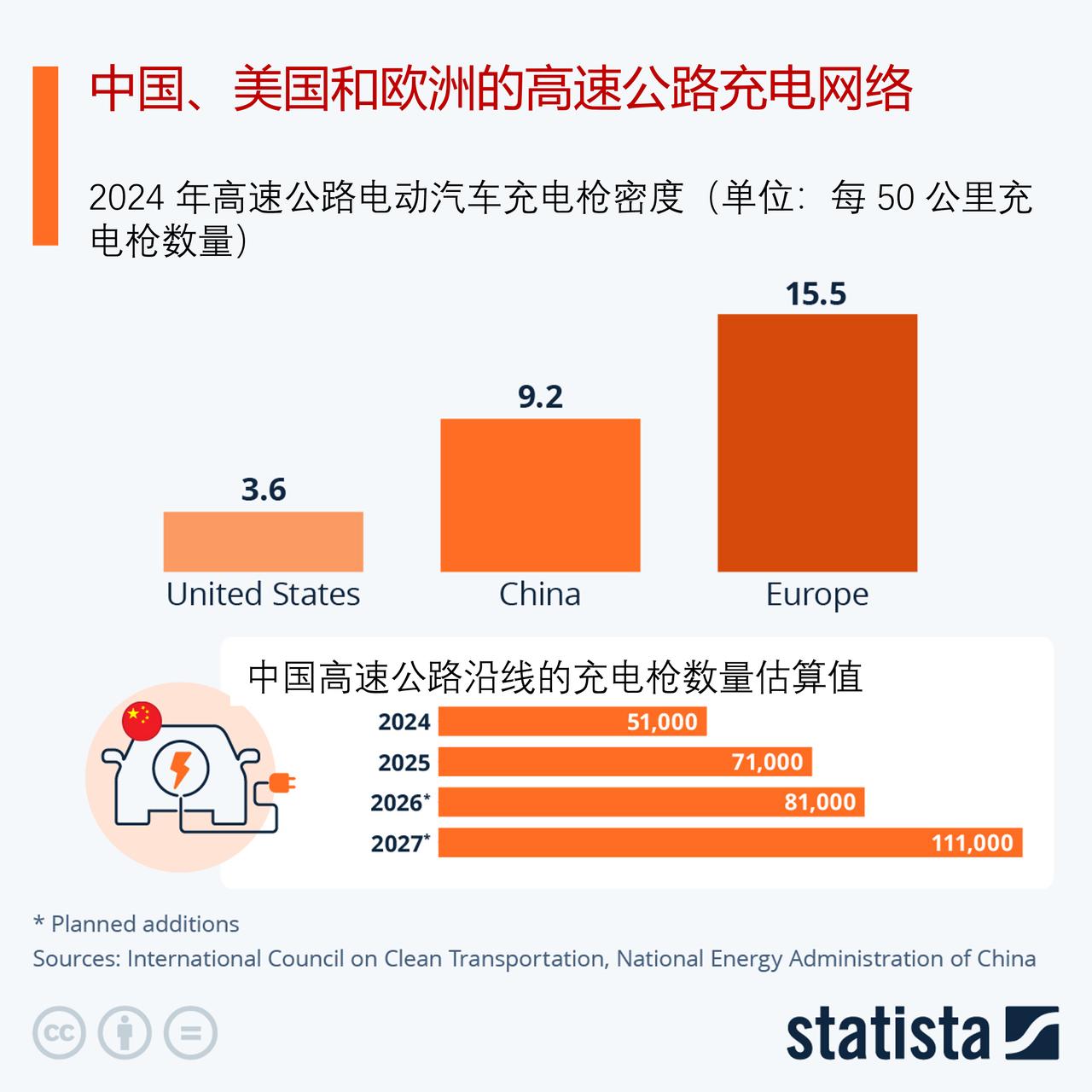 与美欧比,中国的高速公路充电网络处在什么水平? 根据国际清洁交通委员会 2024 年的统计数据,中国高速公路沿线的电动汽车充电网络密度超过了美国,但与欧洲的高速公路充电基础设施相比仍存差距。 尽管中国已经建立了全球规模最大的电动汽车车队和充电基础设施,但这些设施大多集中在电动汽车用户居住的大城市,从而大部分地区排除在外。在像今年 2 月 17 日春节前夕这样的出行高峰期,这种情况就显得尤为突出。有关中国电动汽车用户的报道中经常提到与节假日相关的高速公路续航焦虑问题。 中国正在其 2025 至 2027 年的三年行动计划中解决这一问题。2025年底,中国国家能源局宣布,目前高速公路沿线已配备超过 71000 个充电枪,较 2024 年末增加了约 20000 个。预计到 2026 年底还将再增加 10000 个,这使得 2027 年完成 30000 个新增充电枪的目标显得更为紧迫。 国际清洁交通委员会此前的数据表明,欧洲各国之间存在着巨大的差异。截至 2022 年,挪威的高速公路充电枪密度是中国的六倍,处于领先地位。