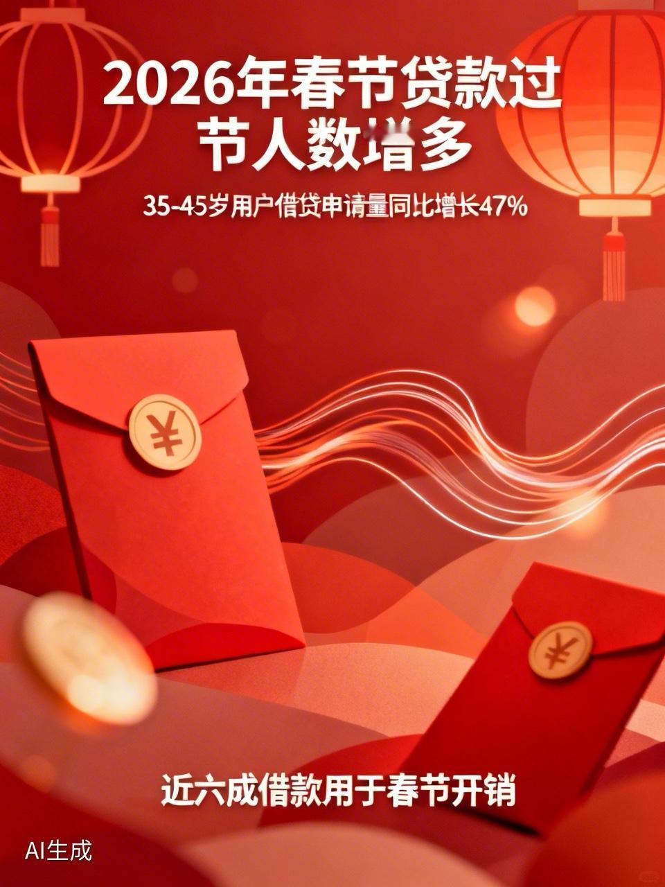 2026 年春节,贷款过节的人数显著增多。 某网贷平台数据显示,2026 年腊月,35 - 45 岁用户的借贷申请量同比增长 47%,近六成借款用于春节开销。不过,这只是单一平台的局部数据。