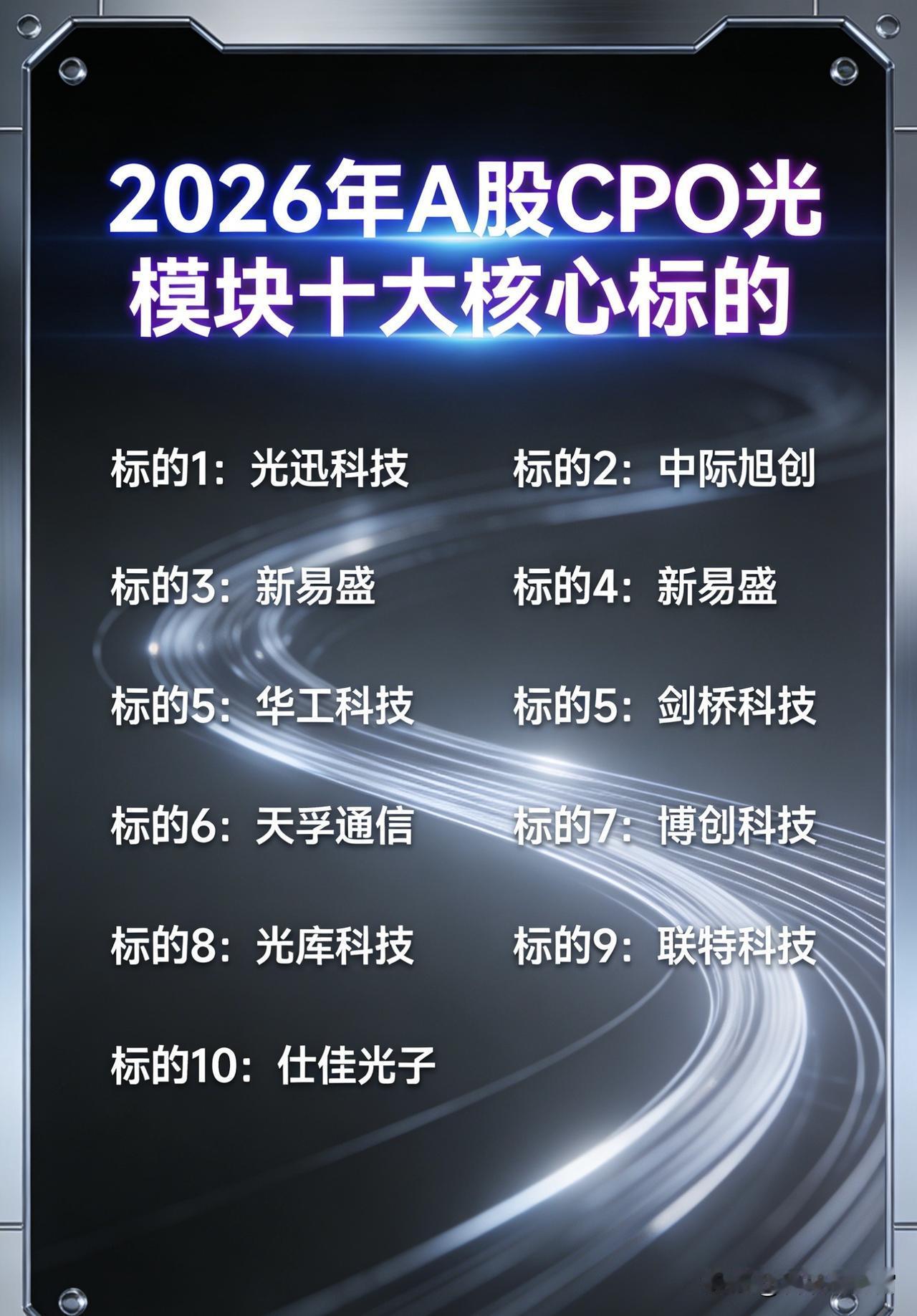 🔥2026年A股CPO光模块十大核心标的:全产业链龙头,算力时代的“卖水人” AI算力需求的爆发式增长,正推动共封装光学(CPO)技术从概念走向大规模商用。2026年,随着1.6T/3.2T产品的量产落地,A股市场涌现出一批在全球产业链中占据关键地位的核心企业。以下是覆盖从上游芯片到下游整机的十大CPO光模块龙头: 1. 中际旭创(300308):全球光模块绝对龙头,800G产品市占率超40%,1.6T CPO已批量交付英伟达、微软等顶级客户,是算力网络建设的核心硬件供应商。 2. 天孚通信(300394):CPO光引擎隐形冠军,独家供应英伟达1.6T光引擎,凭借亚微米级耦合技术,在全球光引擎市场占据超60%份额,是CPO技术落地的关键环节。 3. 光迅科技(002281):国内唯一实现“芯片-器件-模块”垂直整合的光通信企业,深度参与国家级CPO项目,在光芯片自主可控和算力国产化浪潮中占据先发优势。 4. 新易盛(300502):北美云厂核心合作伙伴,1.6T产品通过AWS认证,深度绑定Meta、谷歌、亚马逊,海外订单充足,业绩增长确定性强。 5. 华工科技(000988):率先推出3.2T液冷CPO方案,800G产品已实现批量交付,在国产算力设备和高速光模块领域形成了完整的技术和产品矩阵。 6. 光库科技(300620):国内唯一实现CPO保偏器件规模化量产的企业,其铌酸锂调制器是1.6T/3.2T高速信号传输的核心组件,已切入英伟达供应链。 7. 仕佳光子(688313):AWG芯片国产先锋,国内唯一量产1.6T AWG芯片的企业,打破了海外厂商在上游光芯片领域的垄断。 8. 长飞光纤(601869):全球光纤光缆龙头,市占率稳居世界第一,为CPO及算力网络提供高速、大容量的传输介质,是算力网络的“血管”。 9. 太辰光(300570):光连接器件专家,MPO连接器全球市占率第一,是CPO系统内部高密度连接不可或缺的核心组件。 10. 胜宏科技(300476):CPO专用PCB龙头,作为英伟达指定供应商,批量供应CPO交换机FPC及光模块基板,在高端PCB领域拥有稀缺产能。 ⚠️ 风险提示:本文仅为行业及个股信息梳理,不构成任何投资建议。股市有风险,投资需谨慎。光芯片概念股 中际旭创光模块 光模块产业链 光模块公司