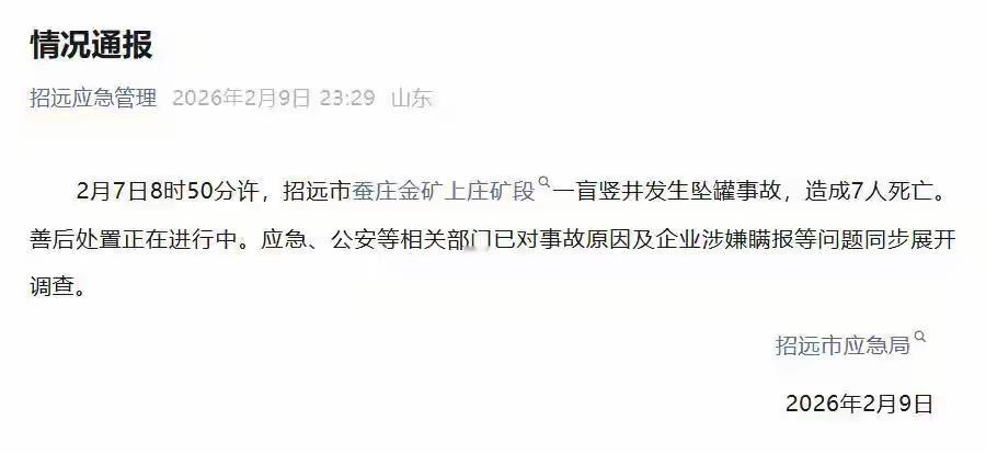 山东招远金矿240米深井惊天坠罐7人命陨,涉事企业两度被罚仍瞒报,谁在纵容带血的金子? (来源:综合央视新闻、极目新闻等媒体报道) 当罐笼从240米深的矿井直坠井底,7名矿工的生命在黑暗中戛然而止。山东招远蚕庄金矿的这场悲剧,发生在2月7日清晨,但直到两天后,才因举报而被迫公之于众。涉事企业涉嫌瞒报的冰冷操作,比矿井更深寒。 我们不禁要问,究竟是什么让企业对7条人命的消逝如此沉默?调查显示,出事的蚕庄金矿在去年8月和12月已两度因安全设备不合规、应急物资缺失被罚。区区数万元罚款,在黄金开采的巨大利润面前,仿佛只是一张轻飘飘的纸。 “双重保险的钢绳同时断裂”,官方描述的事故直接原因听起来像极了小概率的“意外”。但真的只是意外吗?当日常检查流于形式,当安全投入能省则省,当罚款被视作可接受的成本,每一根锈蚀的钢绳,早就在为今天的悲剧倒数计时。 矿工们深入地下,用汗水换取生活的希望,他们信任的是头顶那套号称“双重保险”的安全系统。可当系统失效,信任崩塌,留给家人的只有无尽的绝望。年关将近,团圆桌上永远空缺的座位,将成为七个家庭一生无法愈合的伤疤。 瞒报,是比事故本身更可怕的二次伤害。它企图用时间的尘埃掩盖血迹,用沉默抹杀逝者的存在。从接警到核实,中间数十小时的迟滞,是否延误了本可争取的生机?这消失的两天,必须被彻底照亮,每一个决策者都需直面良知的拷问。 涉事企业11名负责人已被控制,但这远不是终点。从企业到地方监管,一条环环相扣的责任链必须被彻底梳理。安全口号喊得再响,也不如将每一个安全标准钉死在作业面上。监管不能止于“一罚了之”,必须追着整改,盯着落实,直到隐患根除。 黄金闪耀,不应以生命为代价。每一起矿难都在警示我们,发展决不能以安全为赌注。对责任的追究必须严厉到让后来者胆寒,让“安全第一”从墙上的标语,真正变成流淌在血液里的敬畏。 愿逝者安息,愿生者坚强。更愿此番彻查,能铸就真正的安全防线,让每一个辛勤的劳动者,都能平安归家。这是对生命最基本的尊重,也是社会文明不容退让的底线。 矿难瞒报 安全生产