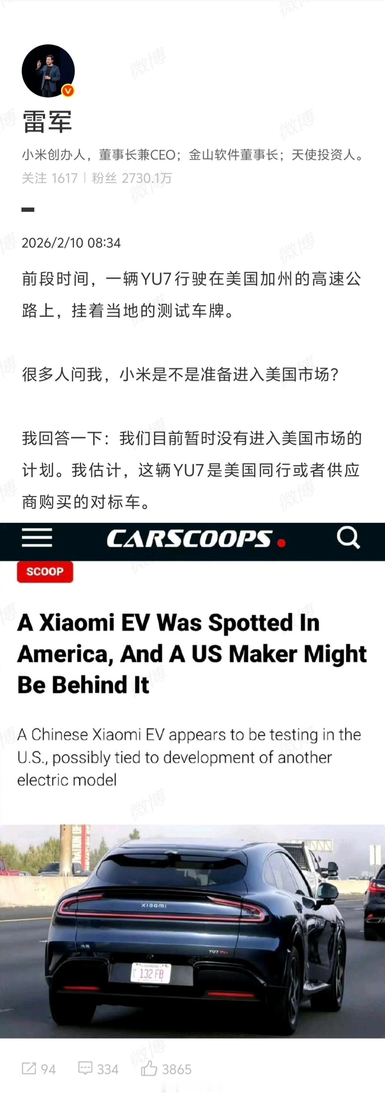 雷总:小米汽车目前暂时没有进入美国市场的计划。