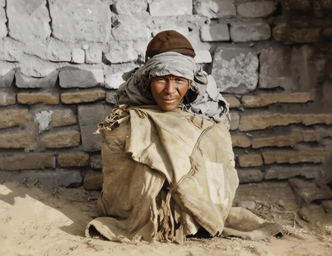 这张照片真实地反映了晚清底层民众,最早收录于《明信片清末中国》一书。男子衣着单薄、破烂,蜷缩在墙角,是当时无数挣扎在死亡线上的底层民众的缩影。