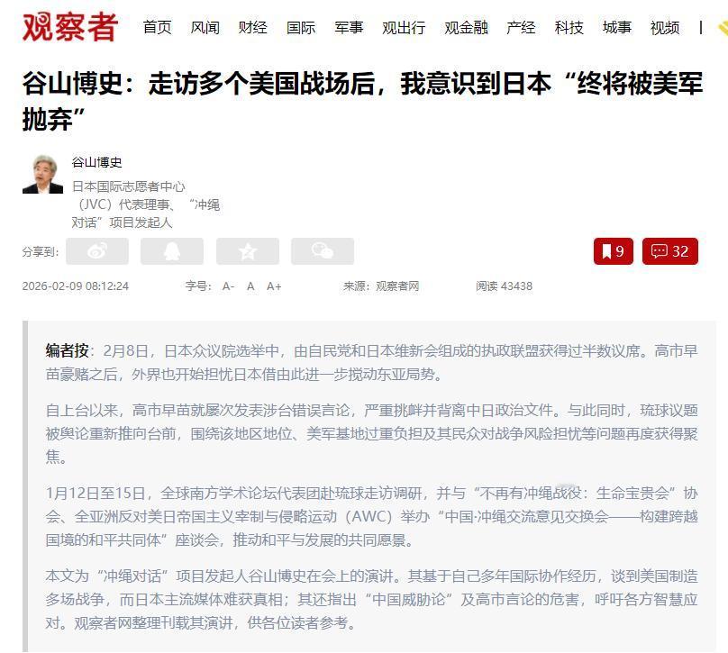 据媒体2月9日报道:日本专家谷山博史直言:走访多个美国战场后,我意识到日本“终将被美军抛弃”! 很多人肯定纳闷,这位日本专家凭啥说这话?毕竟日本和美国,一直喊着是盟友,美军在日本还有好多基地,日本政府也一直靠着美军撑腰,怎么可能被抛弃? 其实谷山博史说的不是空话,都是他亲眼看到、亲身经历后得出的结论,每一句都有依据,不是瞎猜的。 他不是那种坐在办公室里瞎白话的专家,是真的往战乱地区跑的人。这34年里,他去了不少不太平的地方,光在阿富汗就待了四年半,还在当地开了诊所,结果诊所被火箭弹炸过,还被武装人员占过,甚至有工作人员的家人被害死。 每次出这种事,他们找联合国向美军抗议,美军根本不当回事。更让他记牢的是,当时威胁他们安全的,就是从日本冲绳来的美国海军陆战队,后来他就搬到冲绳,想看看驻日美军到底是什么样。 真正让他确定日本会被美军抛弃的,就是美军在阿富汗的所作所为。大家都知道,美军在阿富汗打了二十年仗,2021年仓促撤走,撤走的时候根本没管自己扶起来的阿富汗政府,直接跟塔利班谈好了,把阿富汗政府晾在一边。 结果美军一撤,阿富汗政府就垮了,塔利班很快控制了全国。说白了,美军就是打不赢、耗不起了,拍屁股就走,把自己的盟友扔在那儿不管死活,谷山博史说,这就是美军的本性。 有人说,阿富汗跟日本不一样,日本是美国重要盟友,美军不会扔了日本。但谷山博史不这么认为,他说美军结盟只看自己的利益,没有永远的盟友。 日本现在被重视,就是因为美国需要日本当跳板,用日本的基地控制周边。而且近几年美军越来越力不从心,连驻冲绳的美军都只能守着自己的基地,没法支援日本其他地方。 还有件事更能说明问题,2025年美军在日本部署了一款导弹,日本政府花了不少钱,把它当成宝贝,结果美军觉得留在日本危险,没跟日本商量就撤走了。 另外,驻冲绳的美军经常干坏事,酒驾伤人、扔尸体,冲绳人早就怨声载道,但美军有特权,犯了罪日本也没法好好追责,日本根本没话语权。 在美国眼里,日本就是个可有可无的“棋子”。我不得不感叹一句,日本终于有明白人了?不过,他自己看透并没有什么用,在高市早苗的带领下,日本迟早走向灭亡,不过是早晚的问题!
