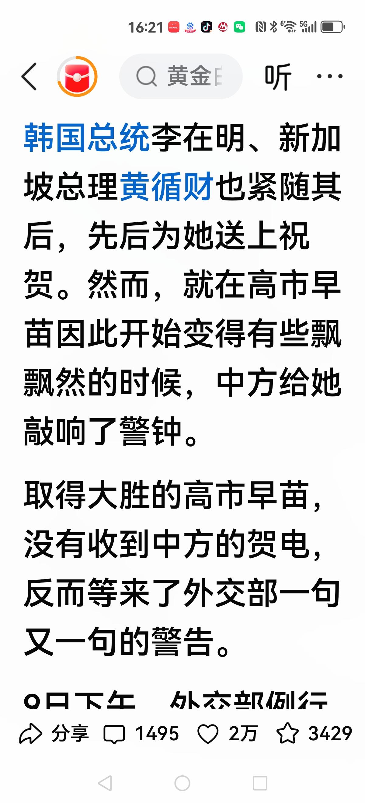 【亚洲格局突变?】 高市当选,在众议院取得压倒性胜利,352票。 接下来就是贺电环节: 韩国总统李在明 新加坡总理黄循财 发出贺电。 我方给个一个警告。 纵观亚洲风云突变,印度彻底投入美国的怀抱。 菲律宾蠢蠢欲动,美军B族轰炸机挂实弹演习。 越南改革越来越亲向美帝,日后很难预料? 俄罗斯苦苦支撑,日子越来越难过,美方给乌克兰一张八千亿支票,看来这仗有的打。 海南封关,是不是给新加坡一记重锤? 亚洲格局突变,血雨不知会不会腥风?