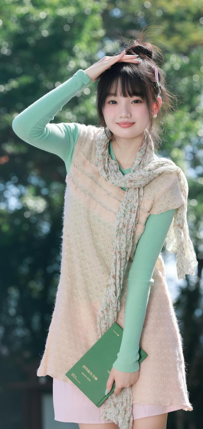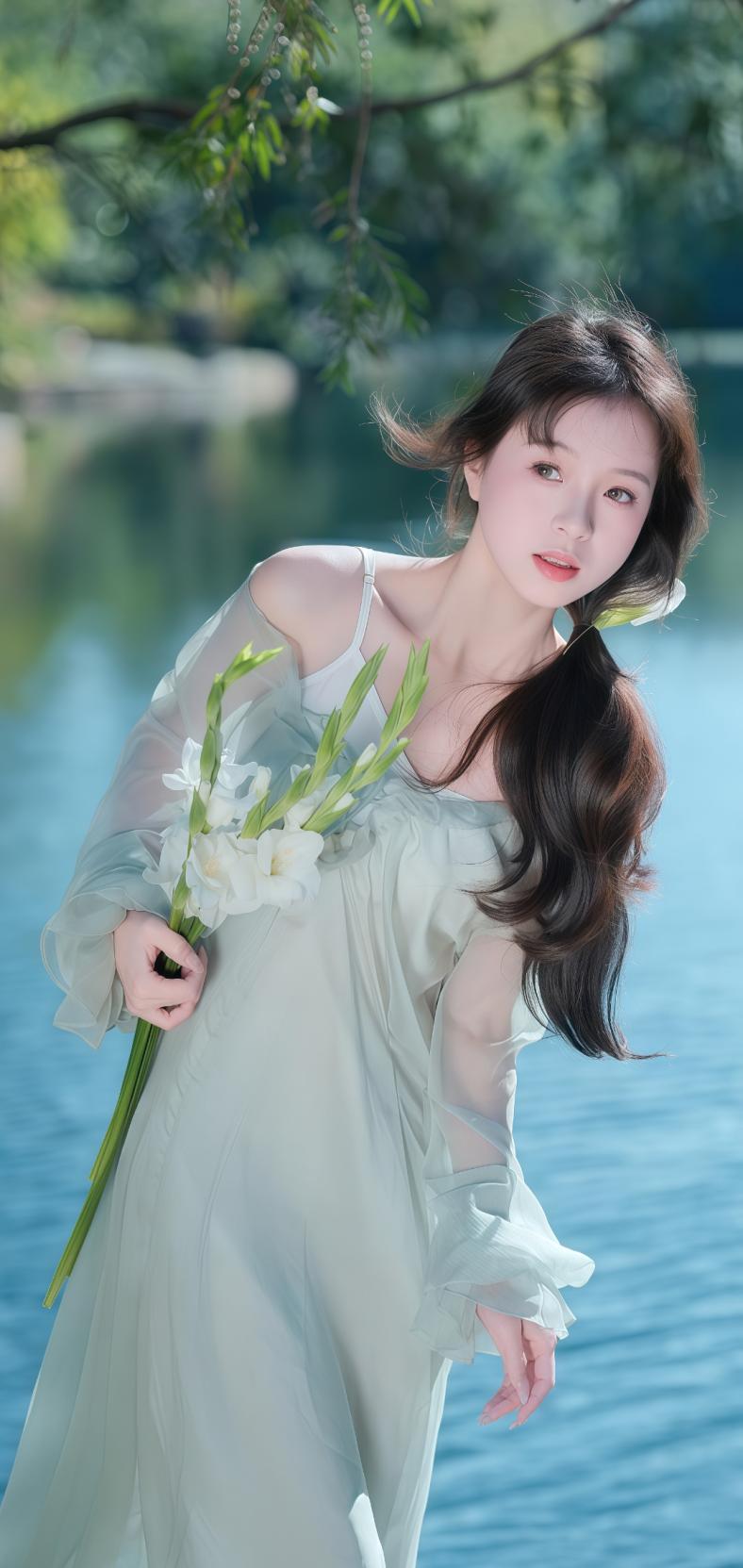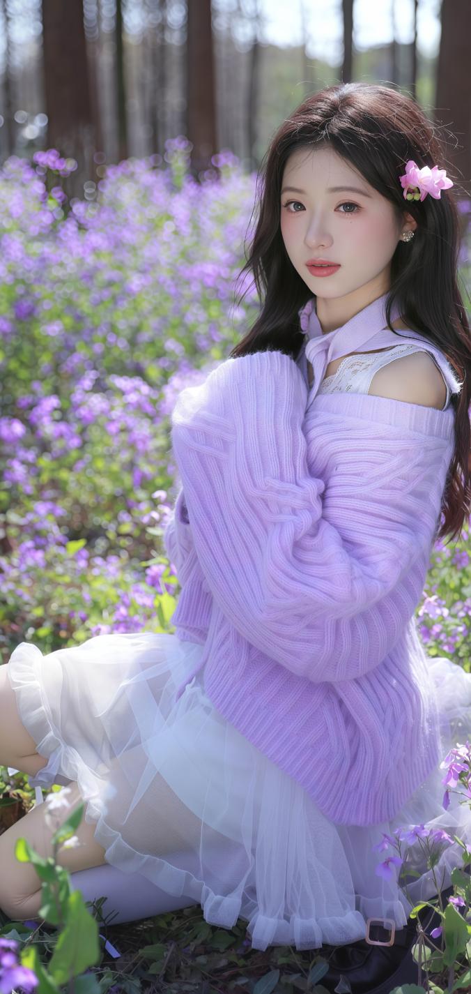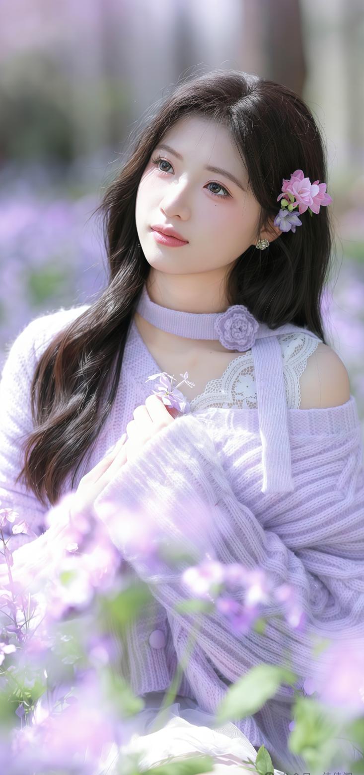 这张图片展现了一位年轻女性置身于一片紫色花海中的场景,整体氛围宁静而梦幻,充满春日浪漫气息。 画面中,她身穿一件淡紫色针织开衫,内搭白色蕾丝吊带,衣着轻柔雅致,与背景的紫色花卉相得益彰。她的长发自然垂落,一侧别着几朵小巧的粉色与淡紫色花朵,增添了几分柔美与自然气息。她手中轻握一枝紫色小花,眼神温柔地望向镜头,神情恬静,仿佛在享受这片刻的宁静与美好。 背景是一片模糊的紫色花丛,营造出柔和的景深效果,使人物主体更加突出。阳光透过花丛洒下,为整个画面增添了一层温暖的光晕,进一步强化了春日午后温馨、惬意的氛围。 这张图片不仅捕捉了人物的柔美神态,也通过色彩与光影的巧妙运用,传达出一种诗意的生活美学,仿佛一首关于春天的温柔诗篇。